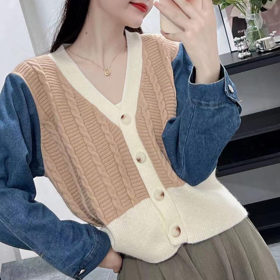 • Conception unique : Le cardigan présente des motifs en tricot texturé à l'avant et des manches en denim décontractées et volumineuses, créant un look tendance.