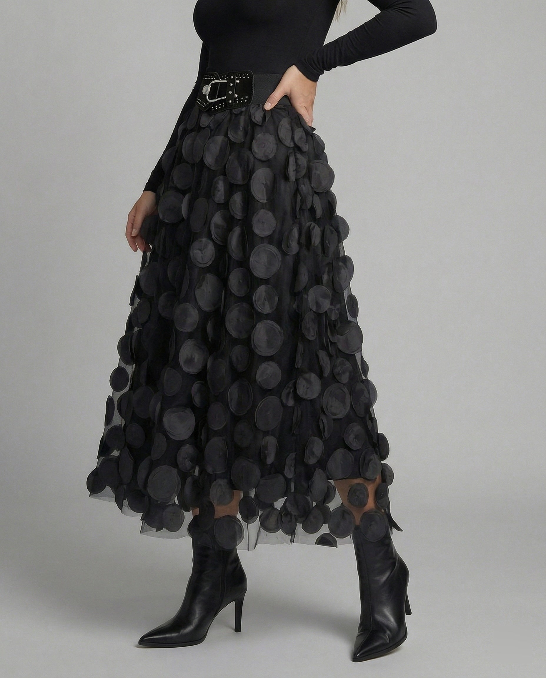 The Chic und Stil skirt combines elegant sophistication with playful charm. The special patchwork of polka dots and tulle gives the skirt a unique, fashionable touch, while the lightweight materials ensure high wearing comfort. Ideal for festive occasions, social evenings, or to add a touch of glamour to your everyday outfit.