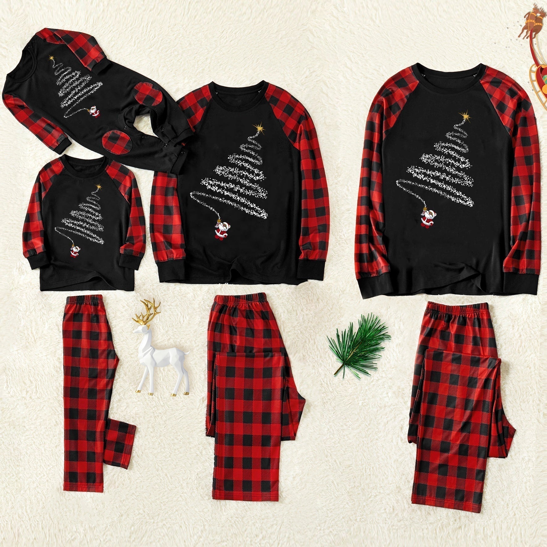 Chic und Stil | Christmas hat and 'Believe' letter print pattern contrast black top and black & red checkered pants family matching pajamas set