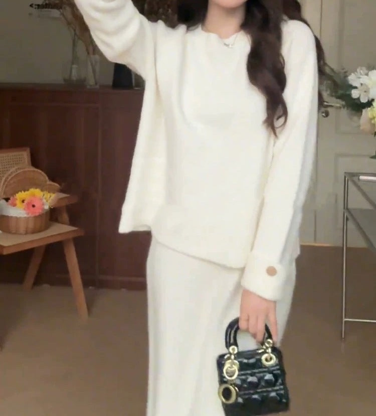 - Coupe confortable : Le pull a une coupe décontractée avec une texture à côtes délicates et des manches légèrement évasées, tandis que la jupe maxi a une coupe flatteuse.