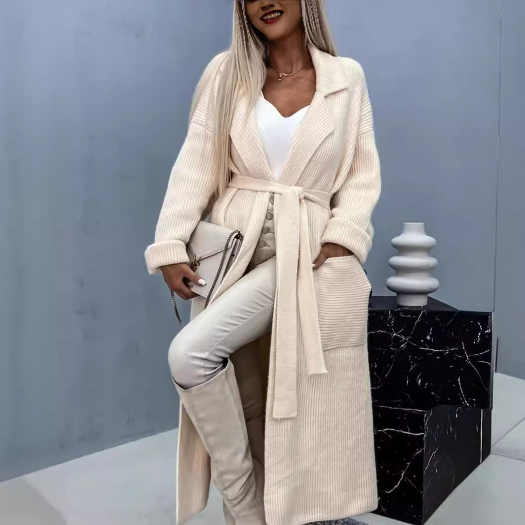 - Design: Long cut with a tie at the waist, creating a feminine silhouette.