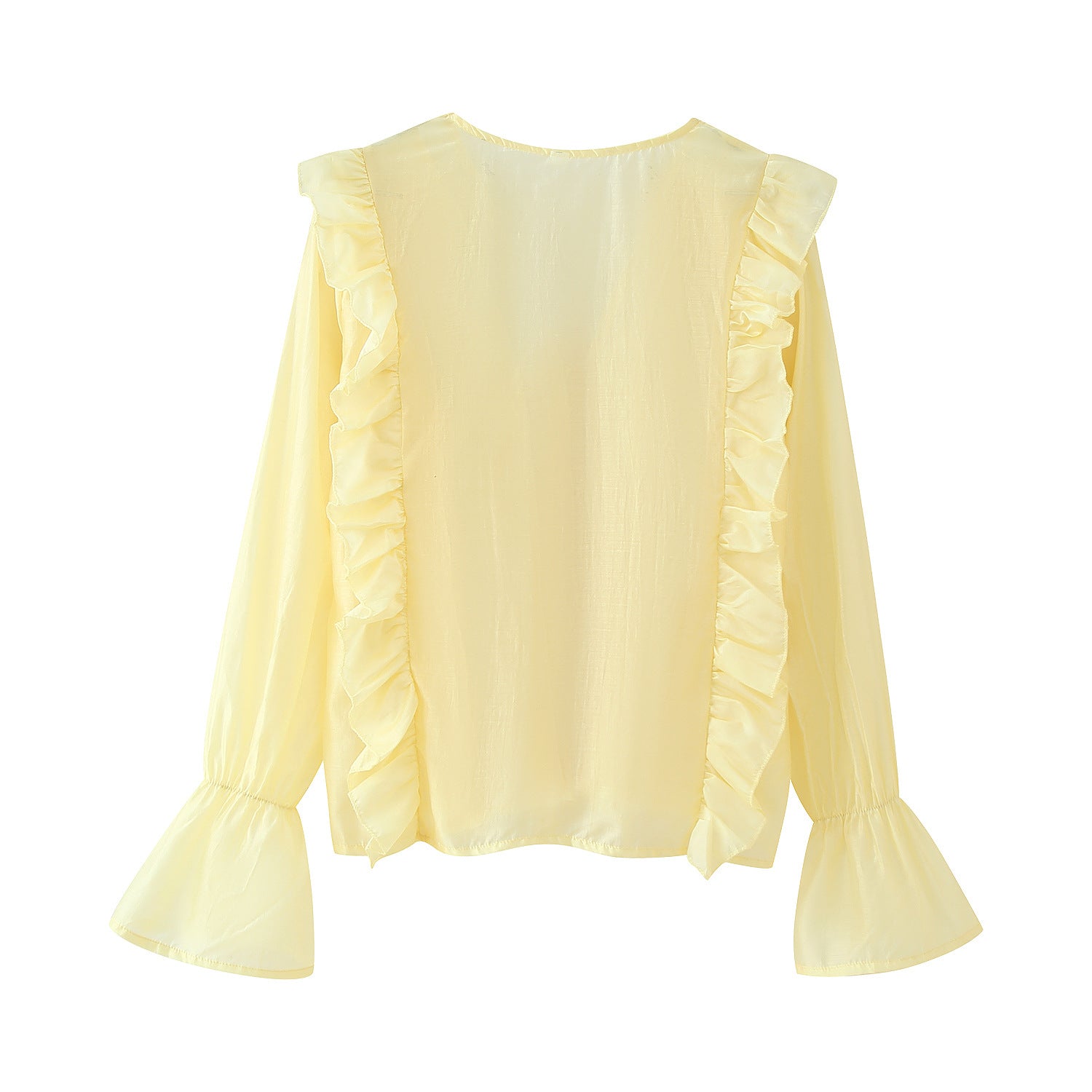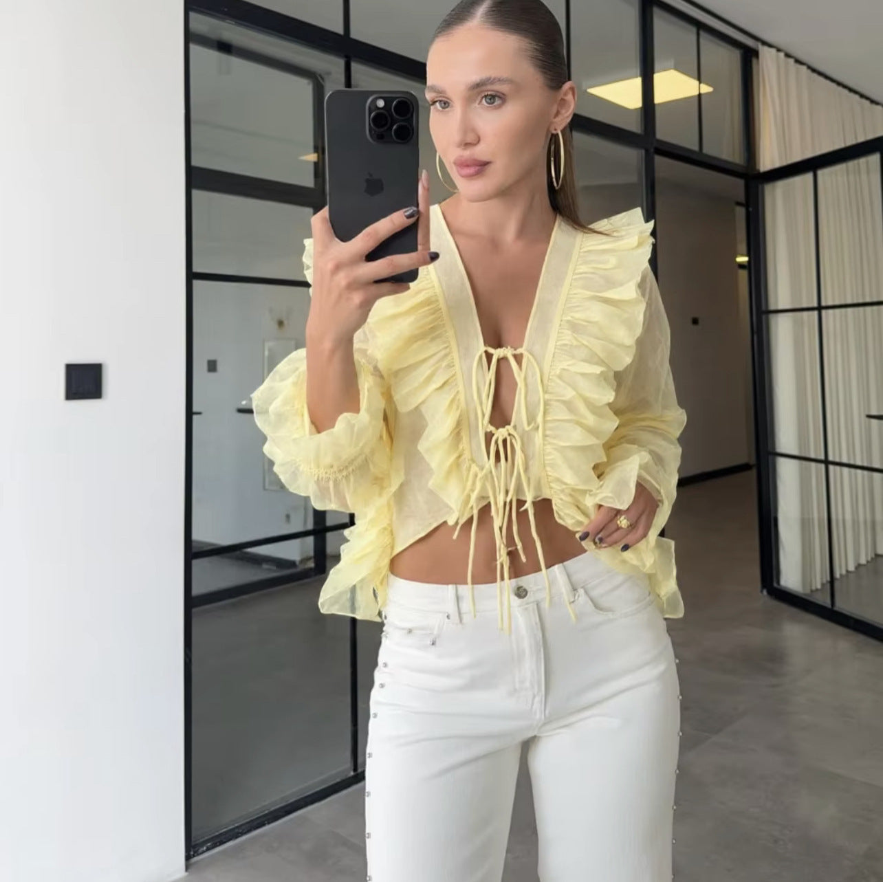 Ce chemisier à volants est un incontournable dans chaque garde-robe et apporte à votre look une expression fraîche et joyeuse. Offrez-vous ce morceau spécial et faites des déclarations de mode !