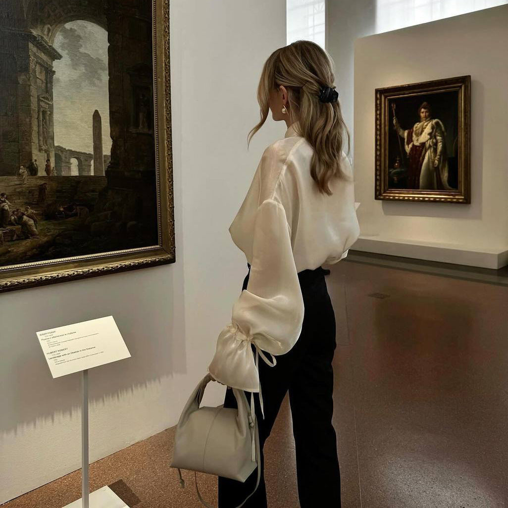 - Manches : Manches volumineuses avec des détails de nouage élégants, qui donnent à la blouse un caractère unique.
