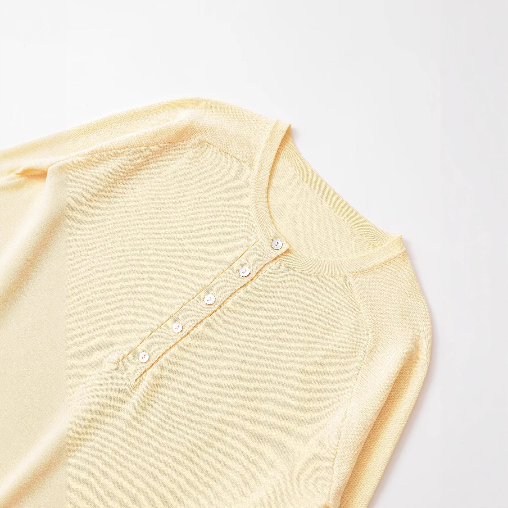 - Décolleté : Col rond avec patte de boutonnage