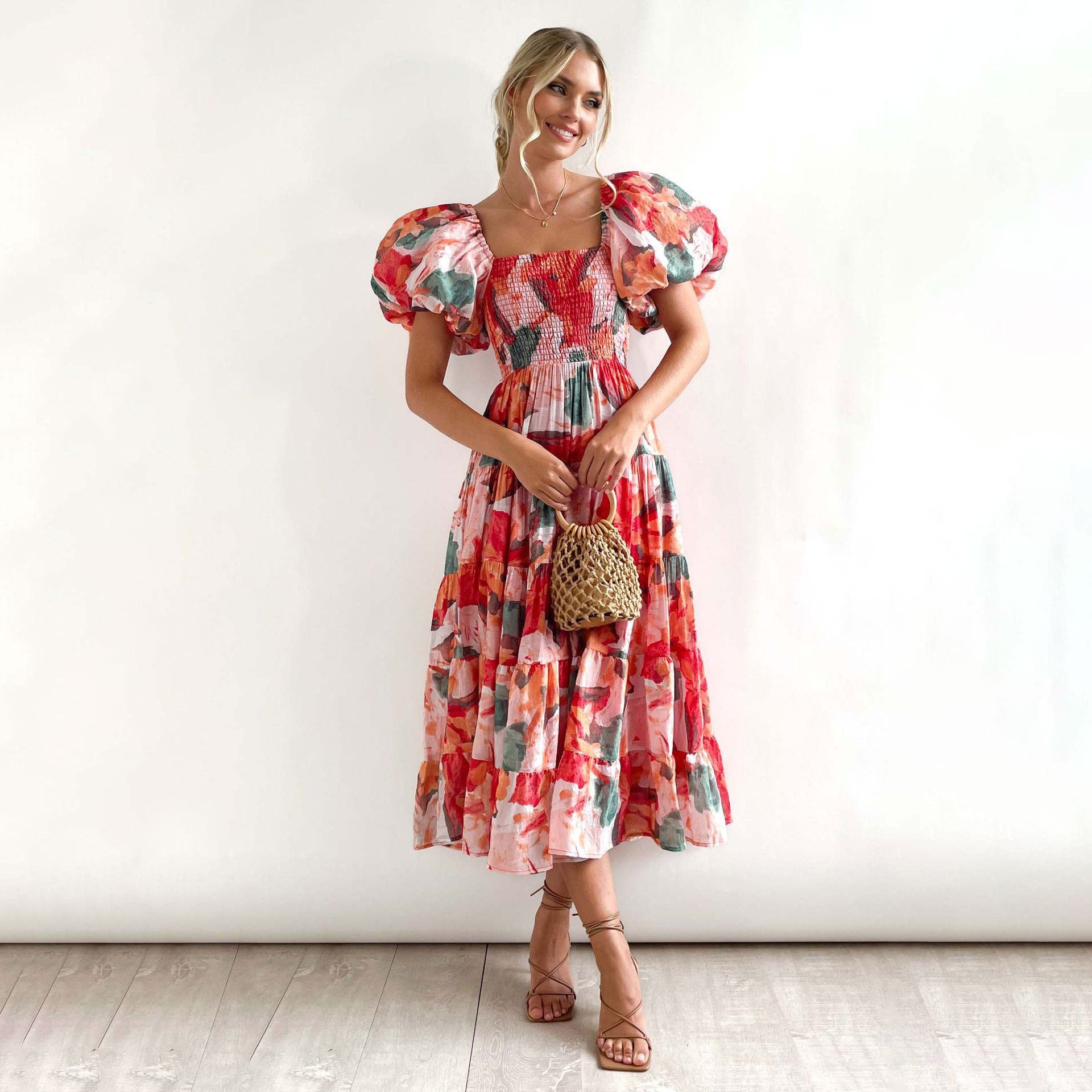 Découvrez la tendance de la robe midi pour femmes avec des manches bouffantes fleuries