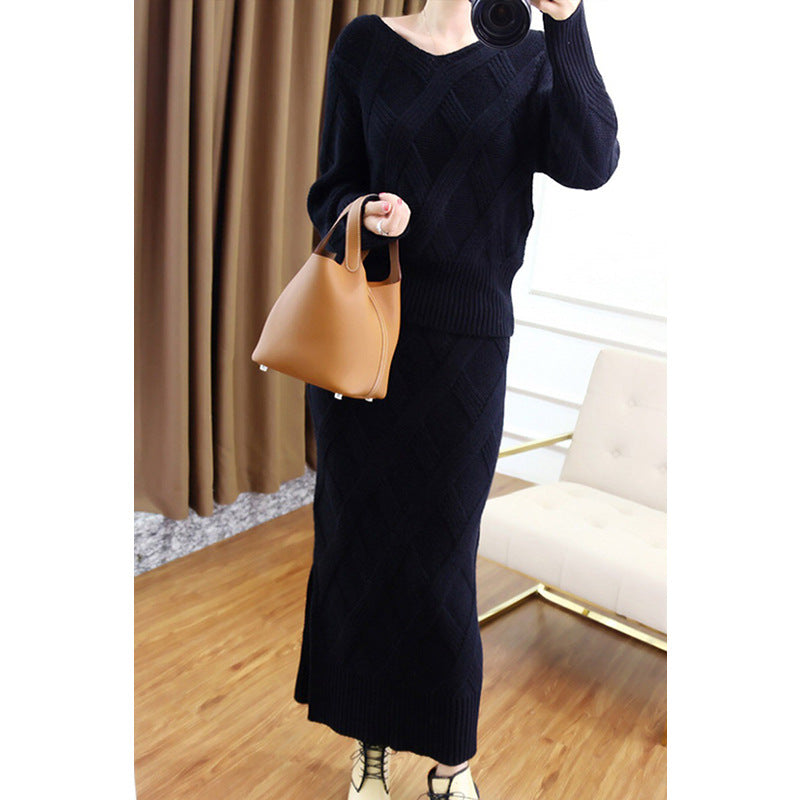 - Design élégant : L'ensemble comprend un pull en v avec des manches relaxées, parfait pour le superposition ou à porter seul, et une jupe longue flatteuse qui accentue votre silhouette.