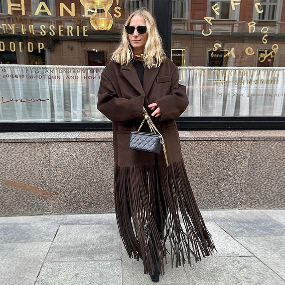 • Design élégant : La coupe oversize offre un look décontracté, tandis que les franges à l'ourlet donnent au manteau une touche à la mode.
