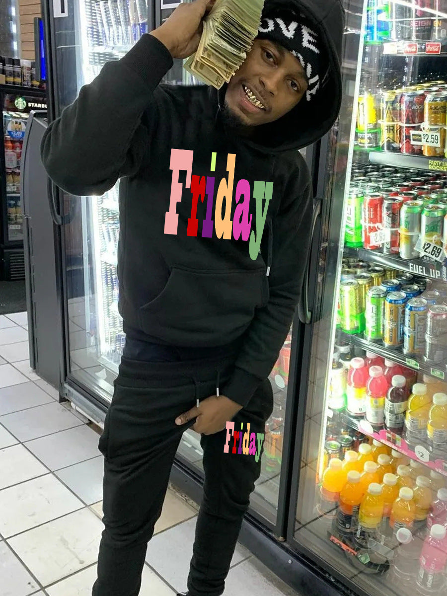 - Hoodie: Hood with drawstring, large kangaroo pocket, and eye-catching "Friday" print in bright colors.