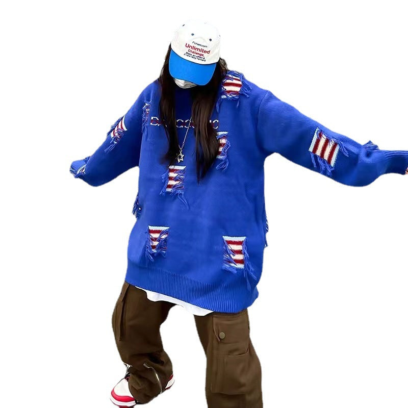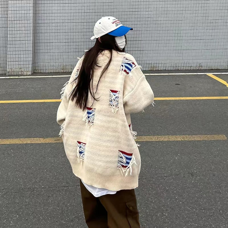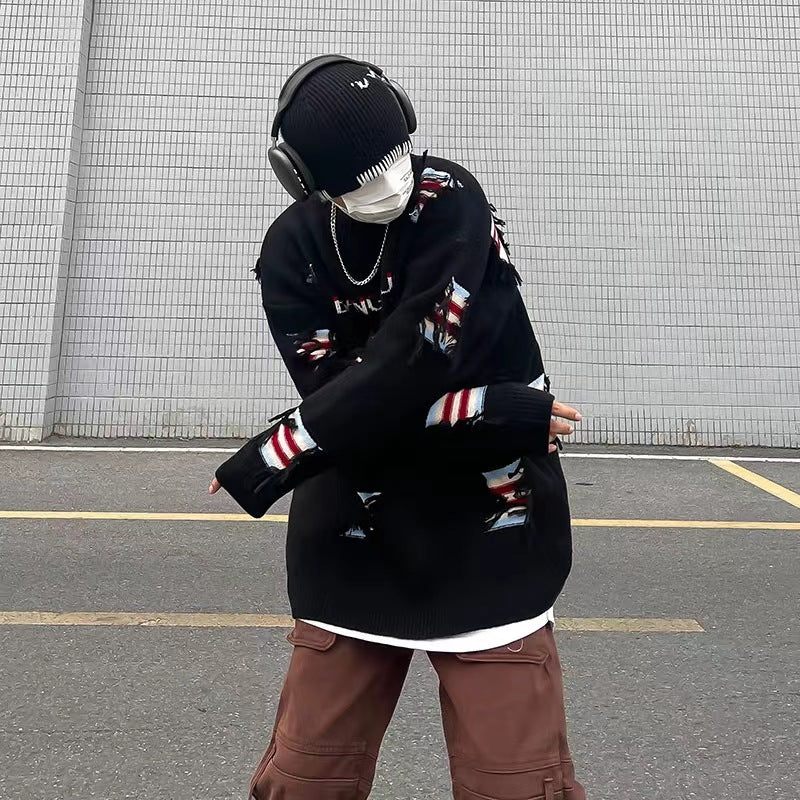 - Unique distressed design: The carefully placed tears and frayed elements give the sweater an urban and modern look.