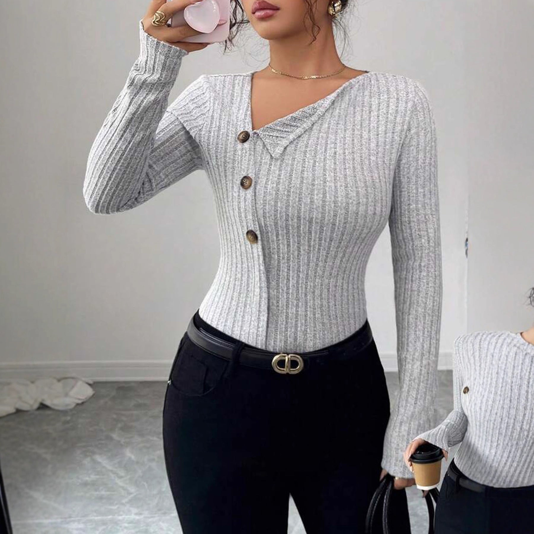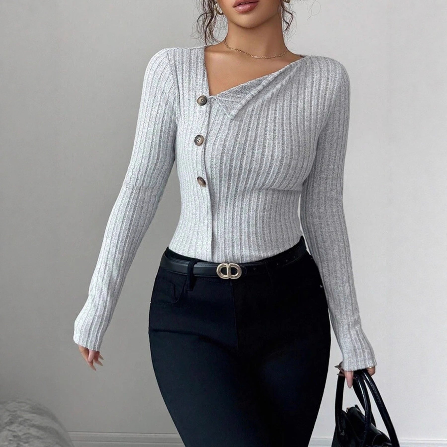 Discover the perfect blend of style and comfort with our ribbed knit sweater for women, tailored to the silhouette. This elegant top not only catches the eye but is also ideal for any occasion. With its unique asymmetrical neckline and trendy button placket, it offers a modern design that easily pairs with different outfits.