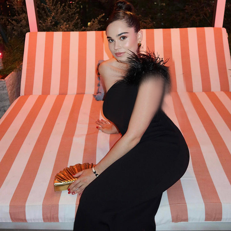 Cette robe de soirée éblouissante pour femmes allie style et sophistication. Elle se distingue par son décolleté séduisant à épaule unique et un volant artistiquement placé en matériaux de haute qualité, qui ajoute une touche spéciale à la robe.