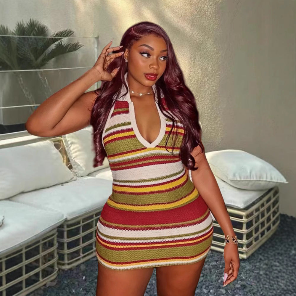 Découvrez notre robe tricotée longueur genou pour dames, qui avec ses couleurs raffinées et son décolleté en V à la mode est non seulement élégante mais aussi confortable. Cette robe combine élégance et décontraction, idéale pour diverses occasions, que ce soit une journée à la plage ou une fête d'été dans le jardin.