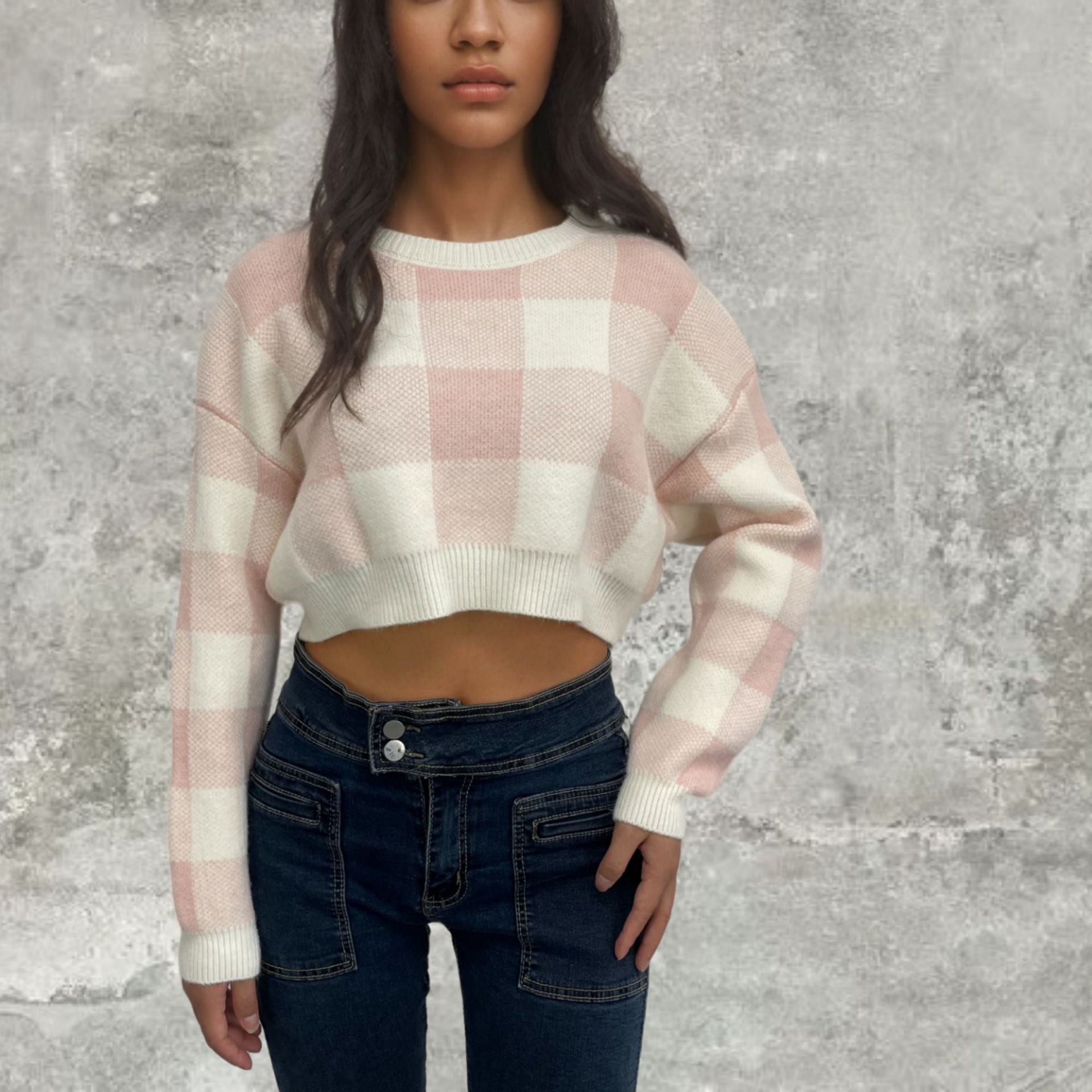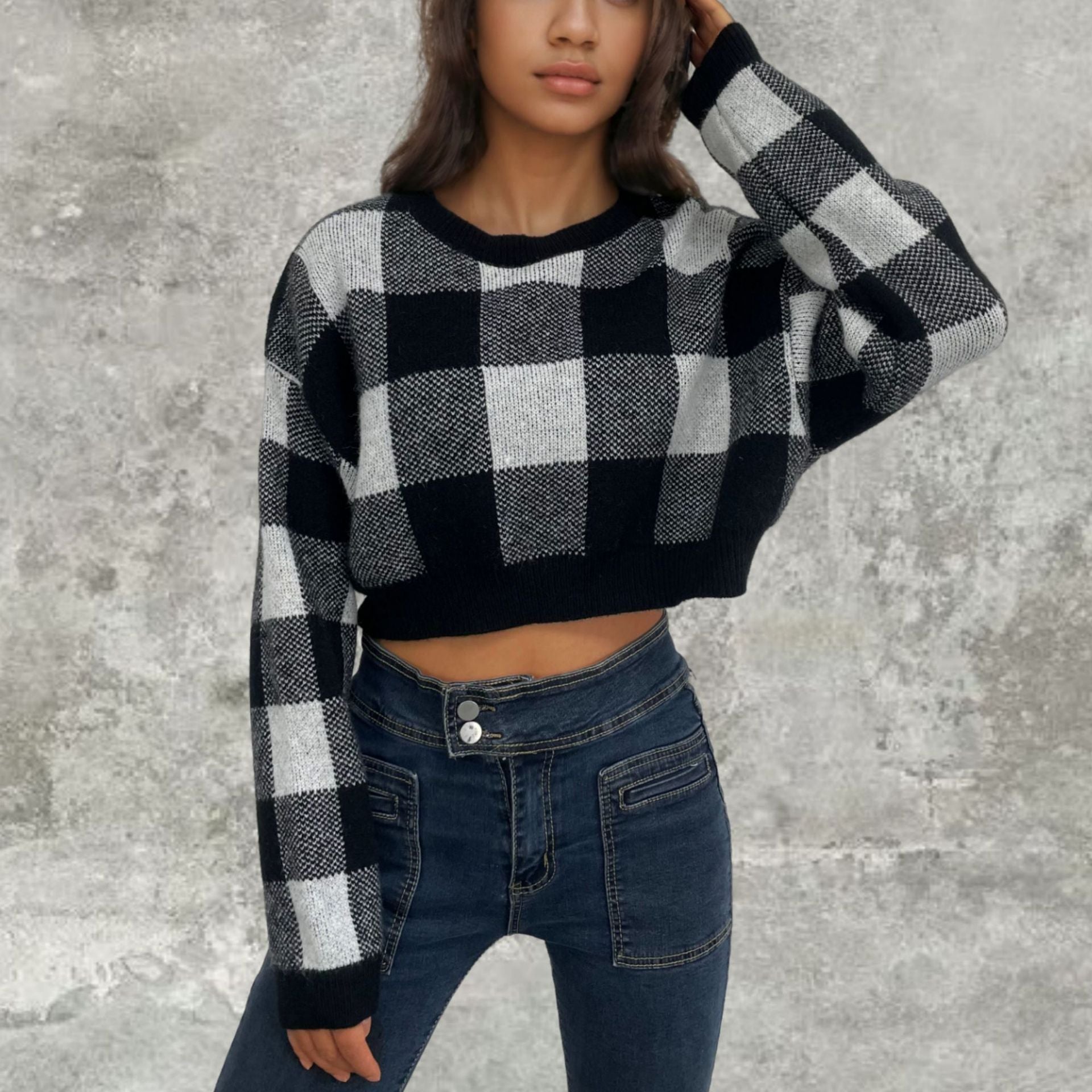 Chic and Style long sleeve cropped sweater for women with checked pattern