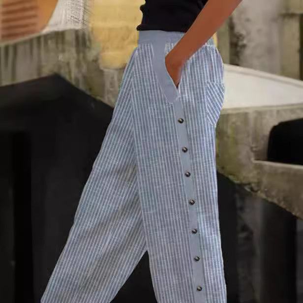 Discover the perfect blend of comfort and fashion with our striped women's pants featuring button details. Designed for the modern woman, these stylish pants offer a chic striped pattern and provide a look that is both elegant and relaxed, suitable for various occasions.