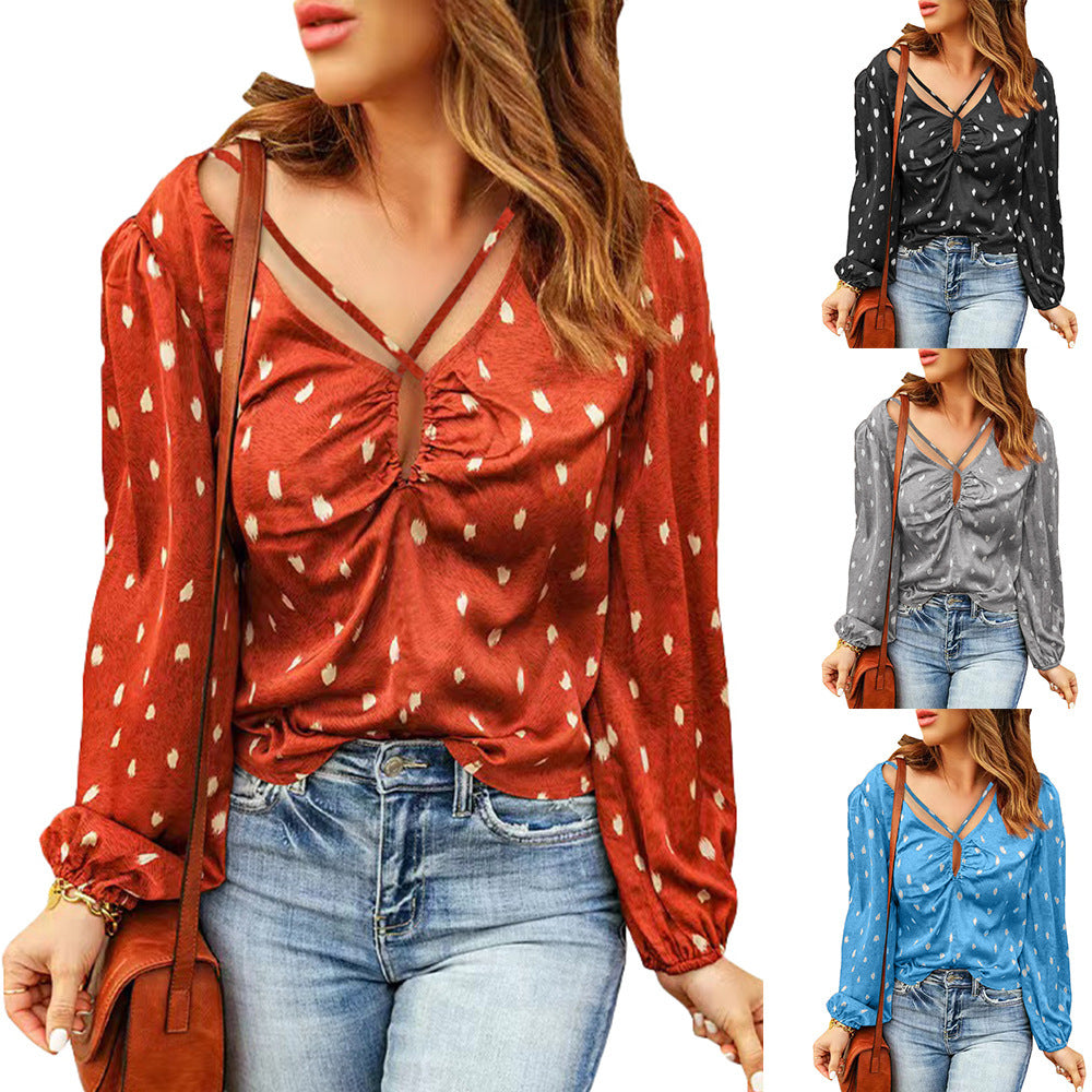 - Design unique : Le décolleté ludique et la silhouette à manches longues donnent à la blouse une touche moderne, tandis que les motifs discrets apportent un look féminin.