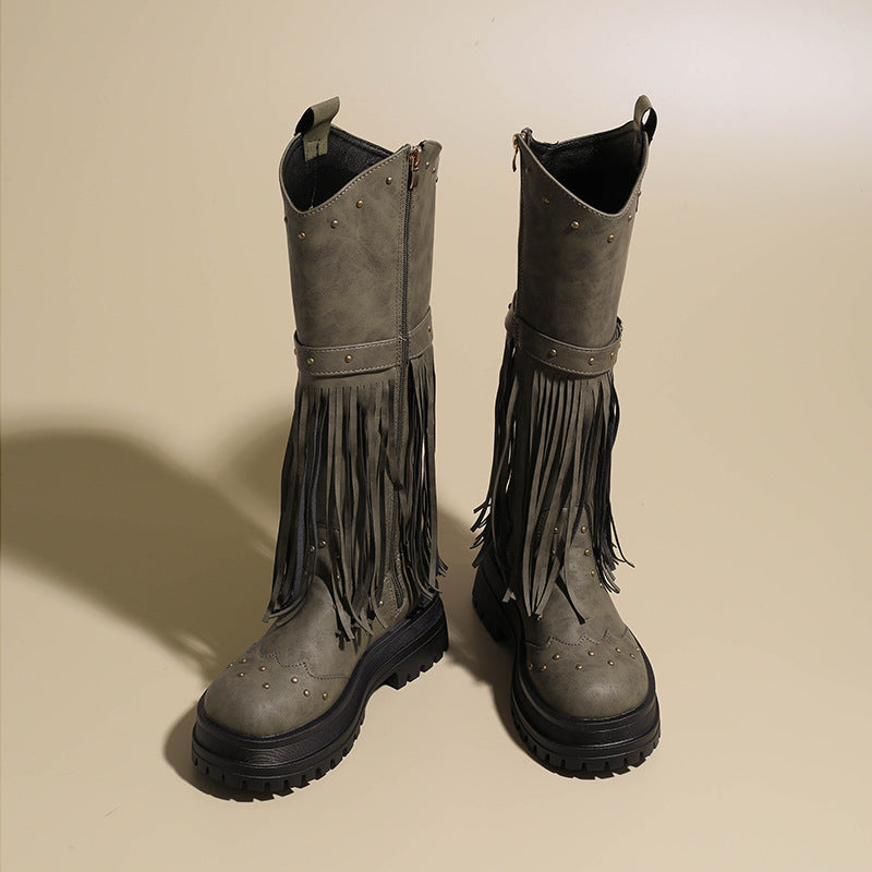 Bottes au-dessus du genou pour femmes avec un design frangé à la mode et un profil robuste Chic und Stil