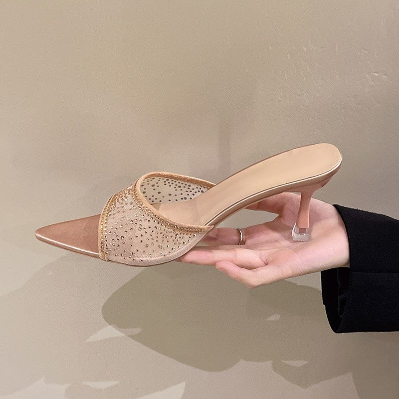 Les chaussures présentent un design exquis avec des strass scintillants qui ajoutent un éclat supplémentaire. Le matériau supérieur transparent donne aux mules une allure moderne, tandis que la coupe classique à pointe allonge visuellement la jambe.