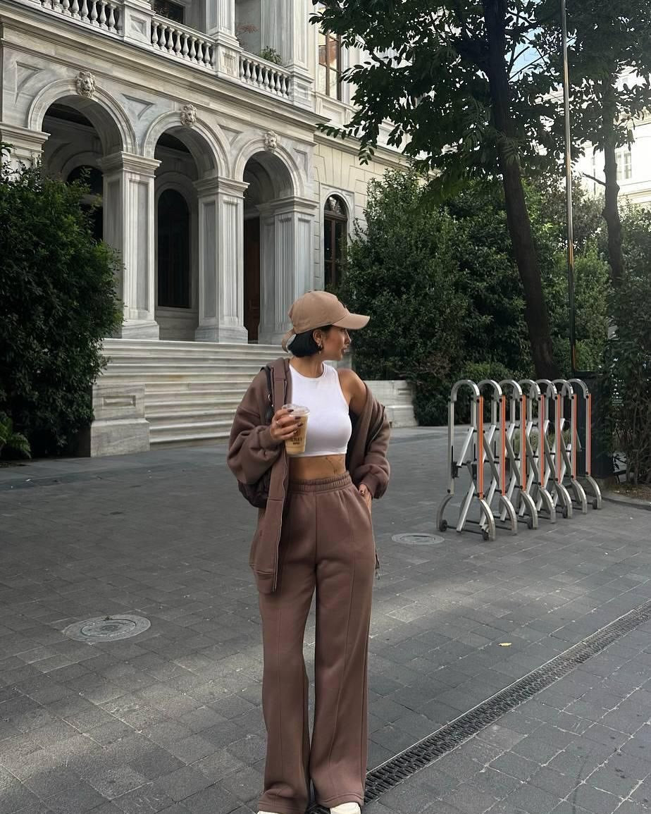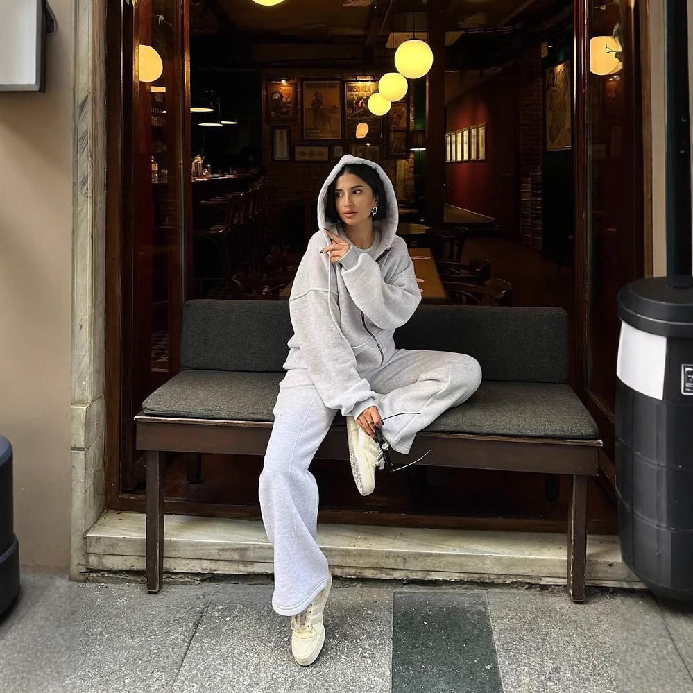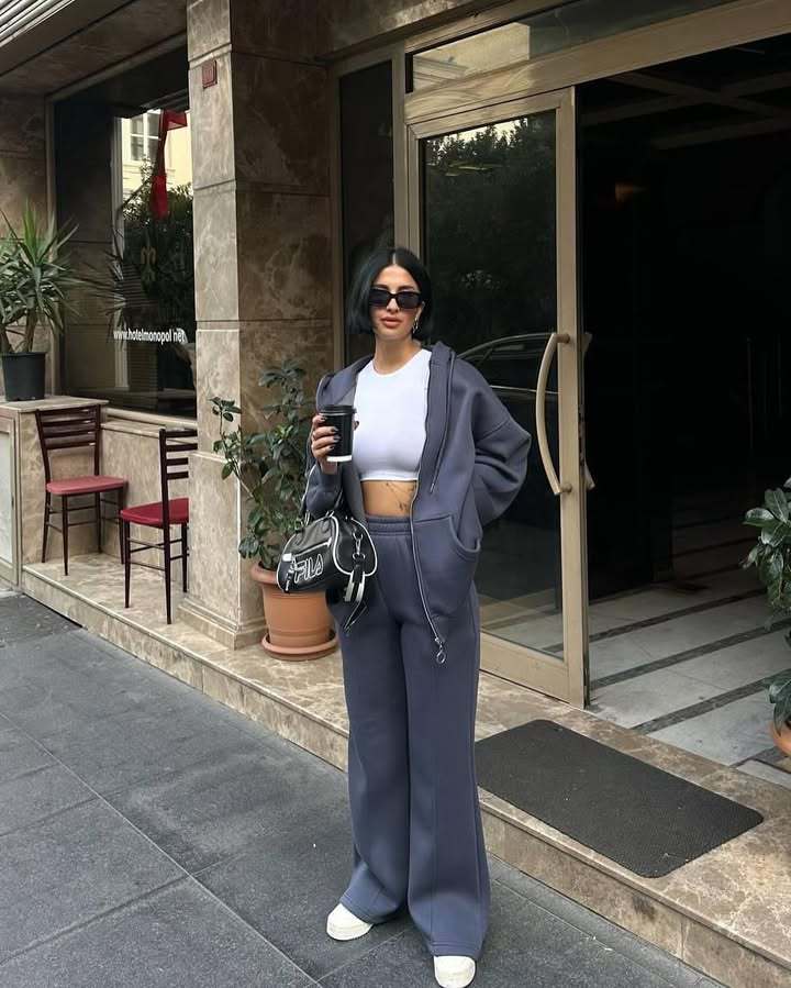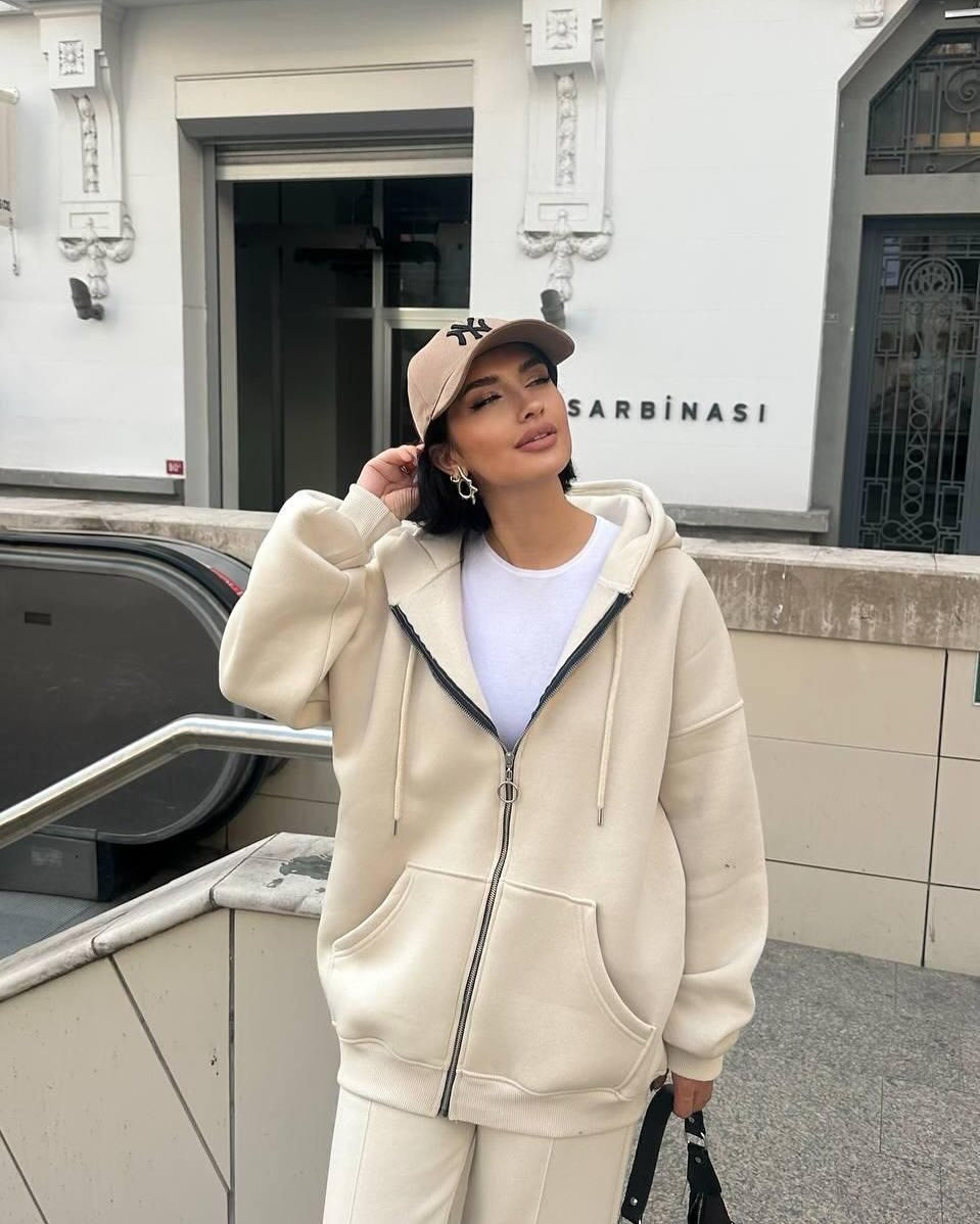 - Coupe tendance : Hoodie oversize avec poches pratiques et pantalons amples pour une silhouette décontractée.