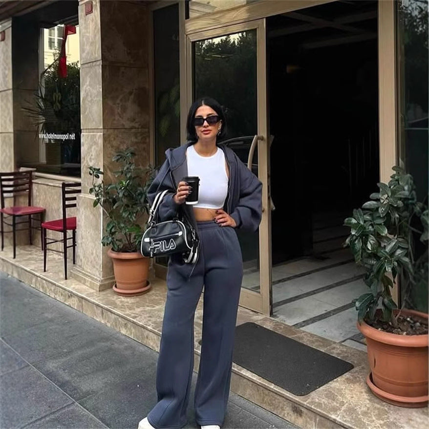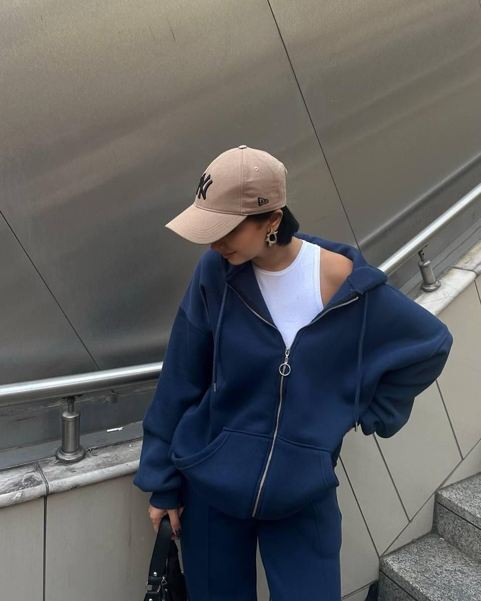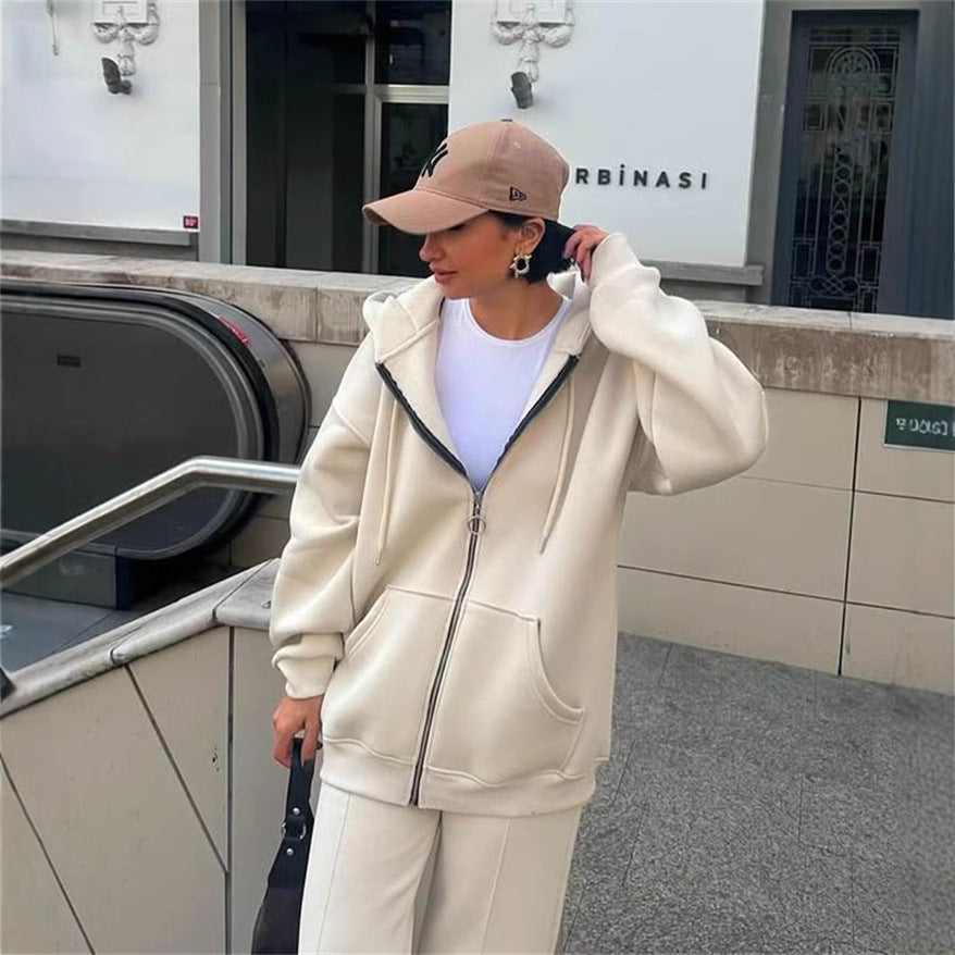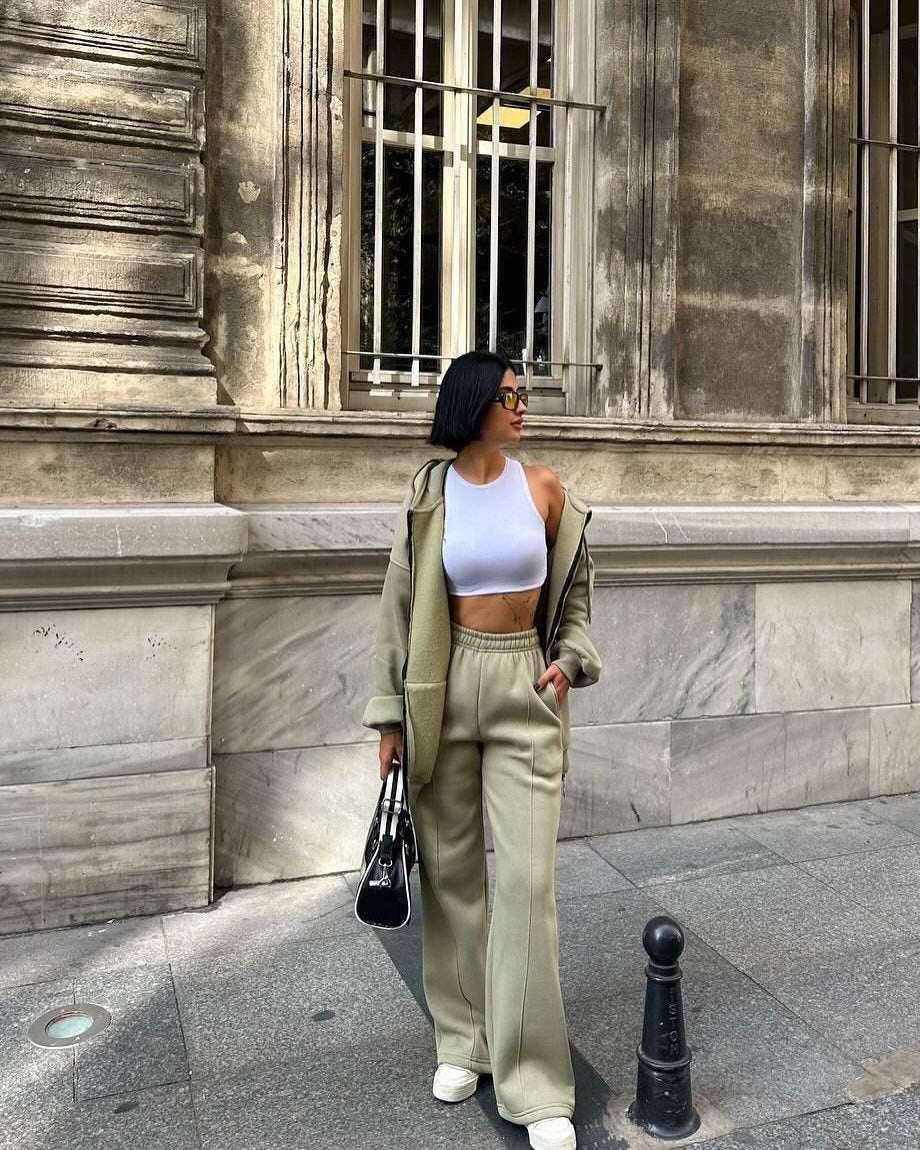 - Coupe tendance : Hoodie oversize avec poches pratiques et pantalons amples pour une silhouette décontractée.