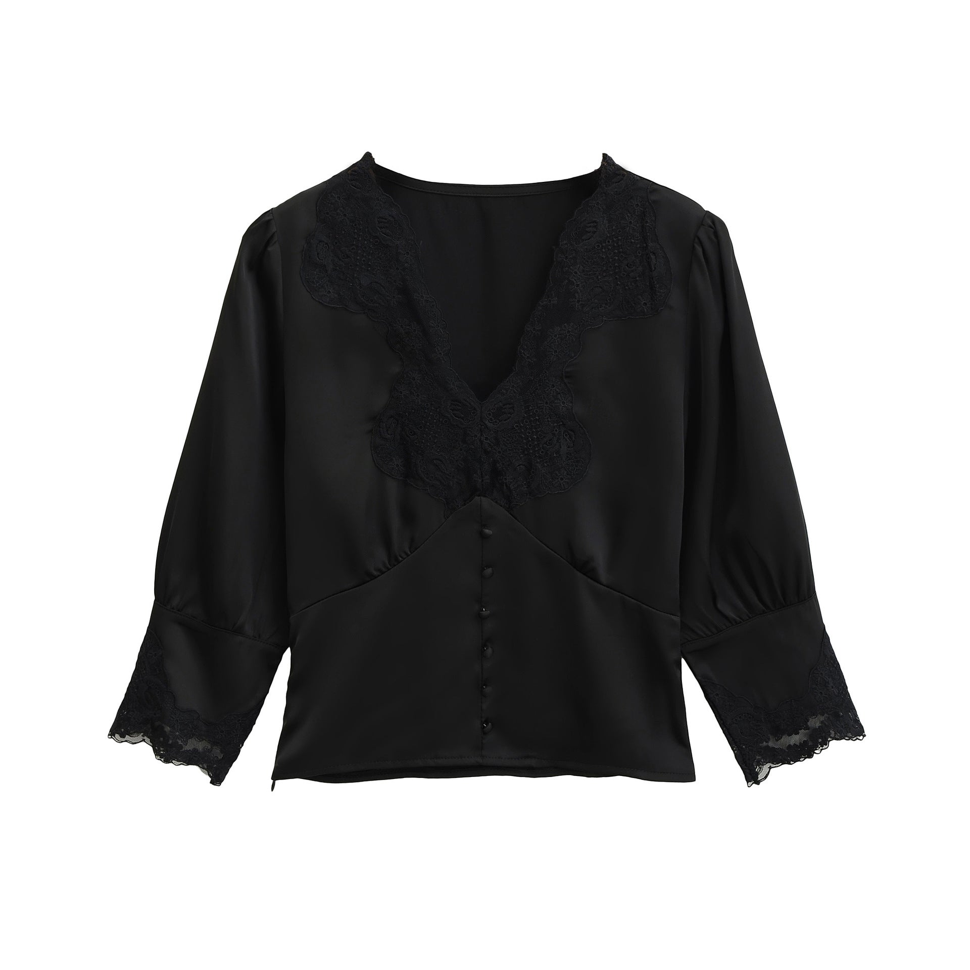 - Détails particuliers : La blouse est ornée d'une superbe bordure en dentelle au col en V et aux manches, ce qui lui confère une touche romantique.