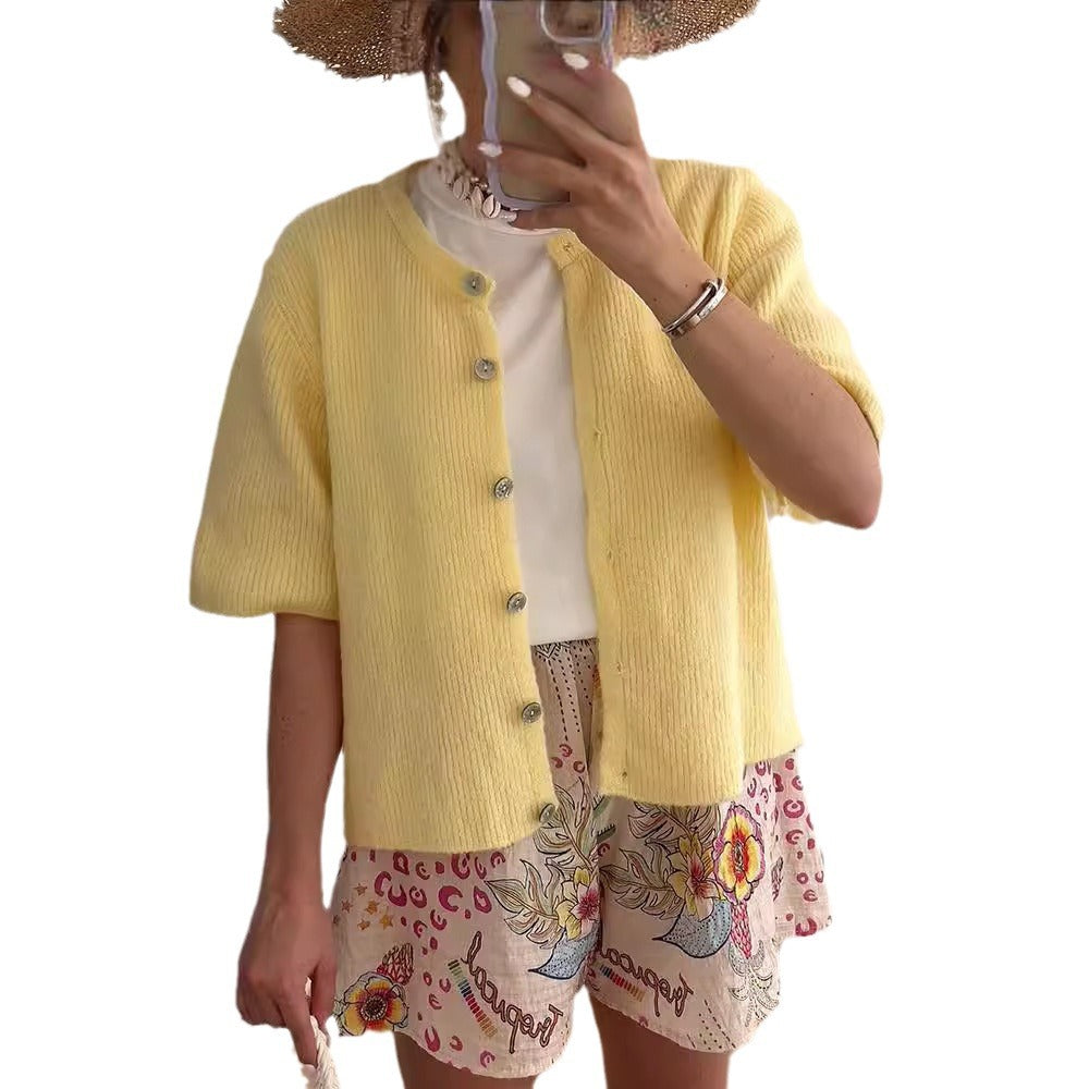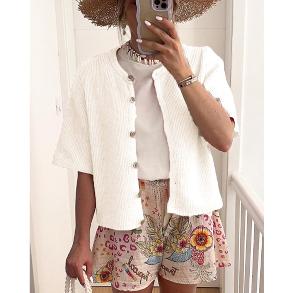 Découvrez notre cardigan léger pour femmes avec des manches courtes et des boutons décoratifs, idéal pour les jours chauds. Fabriqué à partir d'un tissu léger et respirant, ce cardigan offre un confort optimal et un look stylé.