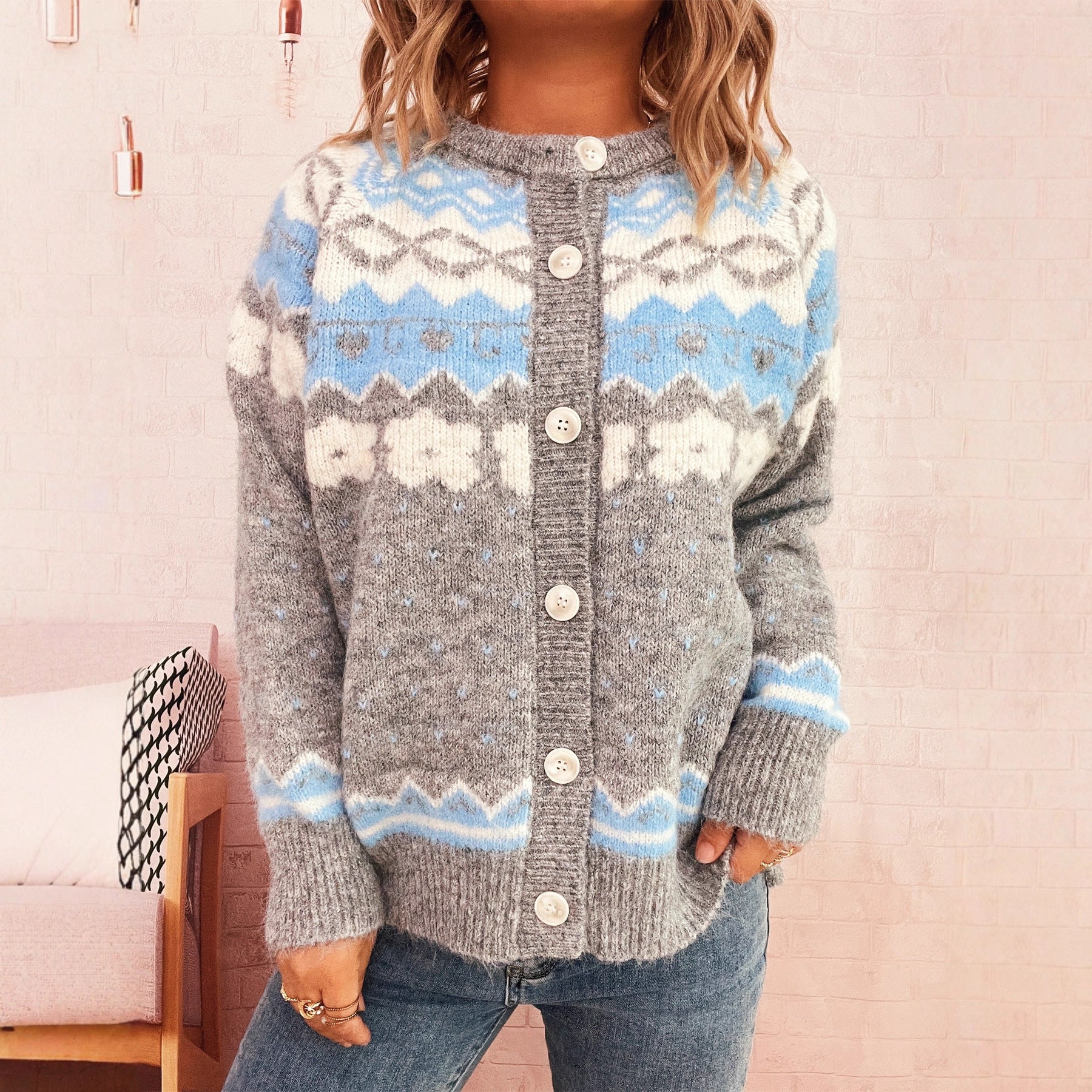 Ce cardigan confortable pour femmes avec des motifs bleus est le complément parfait de votre garde-robe d'automne et d'hiver. Il se distingue par son matériau doux et son design attrayant, idéal pour des looks décontractés et élégants.