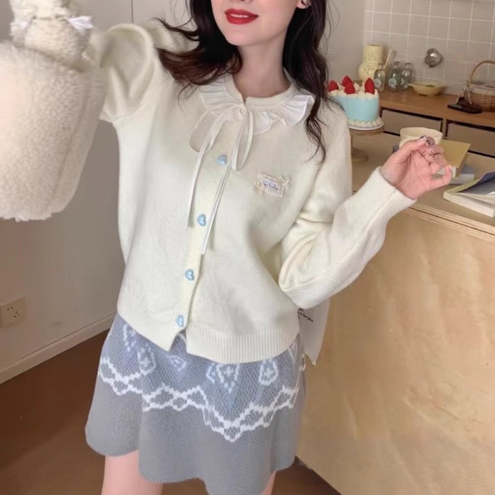 • Détails des boutons : Le cardigan est équipé de boutons imitant des perles, qui ajoutent une touche féminine à l'ensemble.
