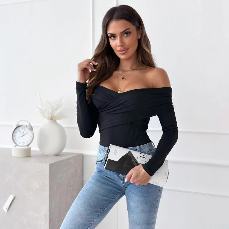 Dames Élégant haut croisé à design épaules nues et manches longues Chic und Stil