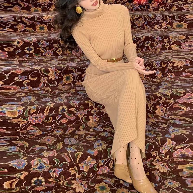 - Design moderne : Le col roulé haut et le motif en fine côte donnent à la robe une touche raffinée.
