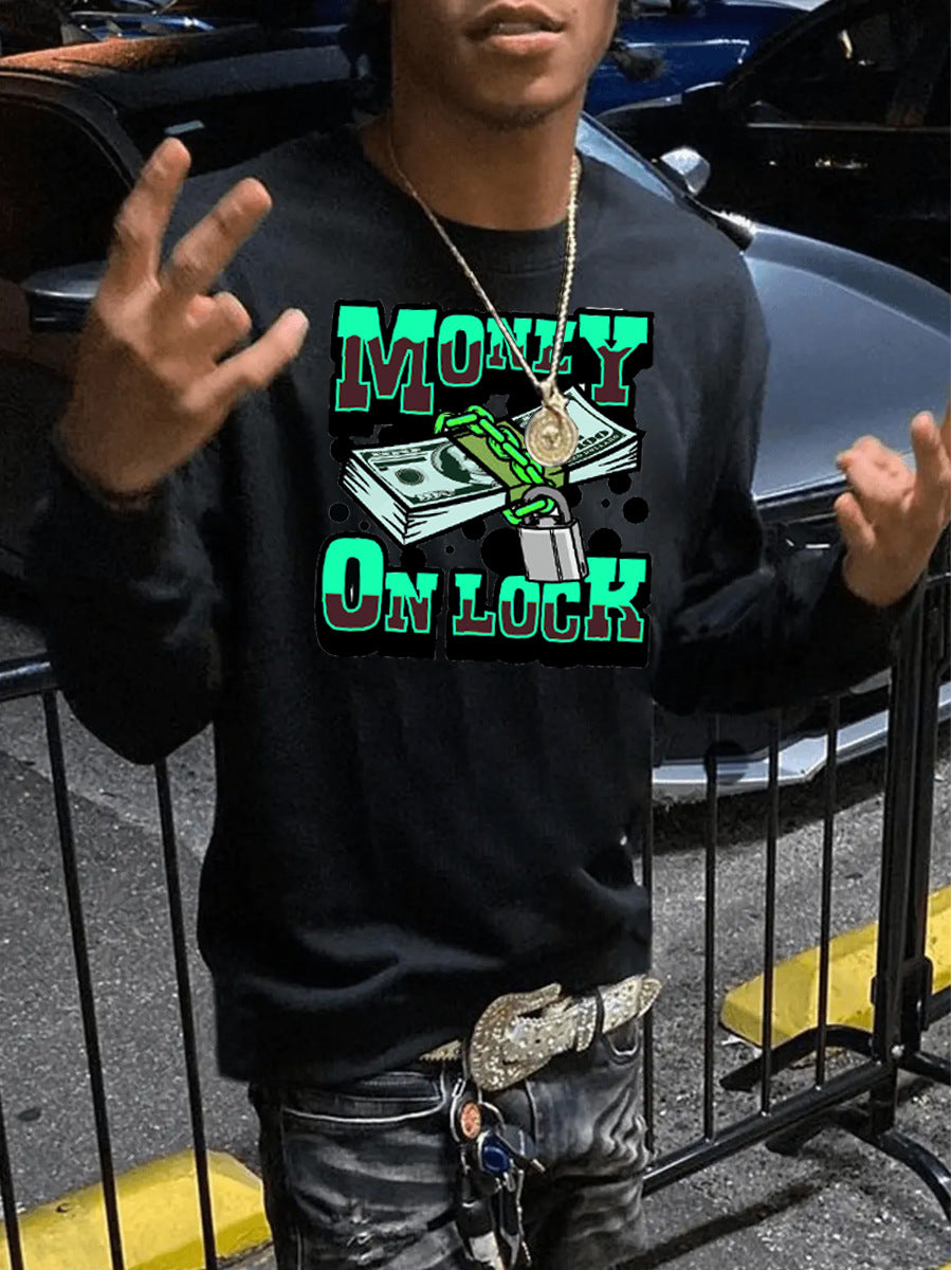 • Design unique : Le design graphique accrocheur avec l'inscription "Money On Lock" donne au pull un look moderne et urbain.