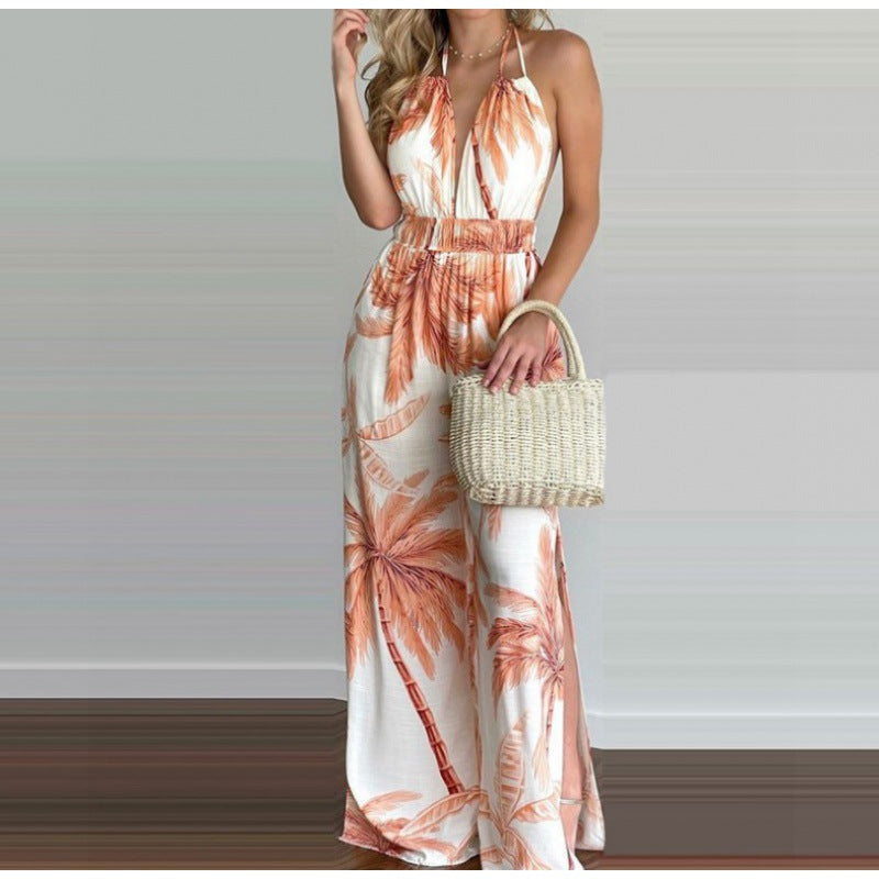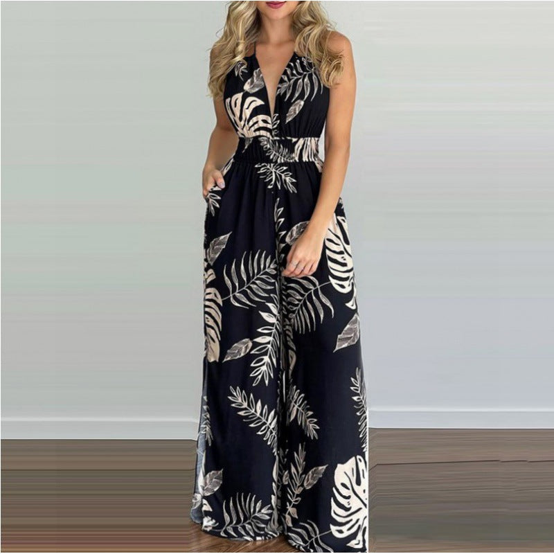 Dames Imprimé Tropical Jumpsuit Haut Fendu Chic und Stil