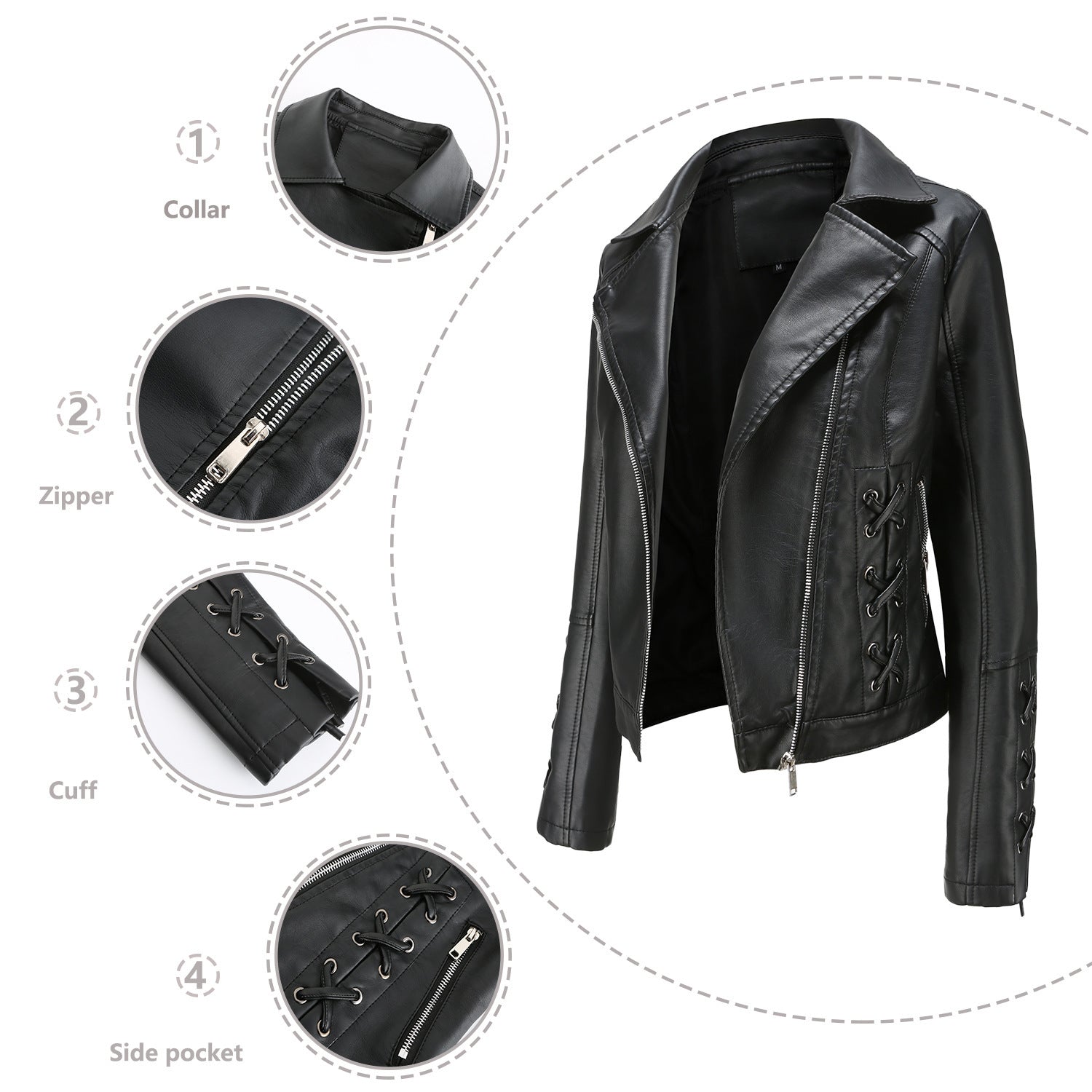 - Design créatif : Les détails de lacets sur les manches soulignent le look de biker unique et donnent à la veste une touche personnelle.