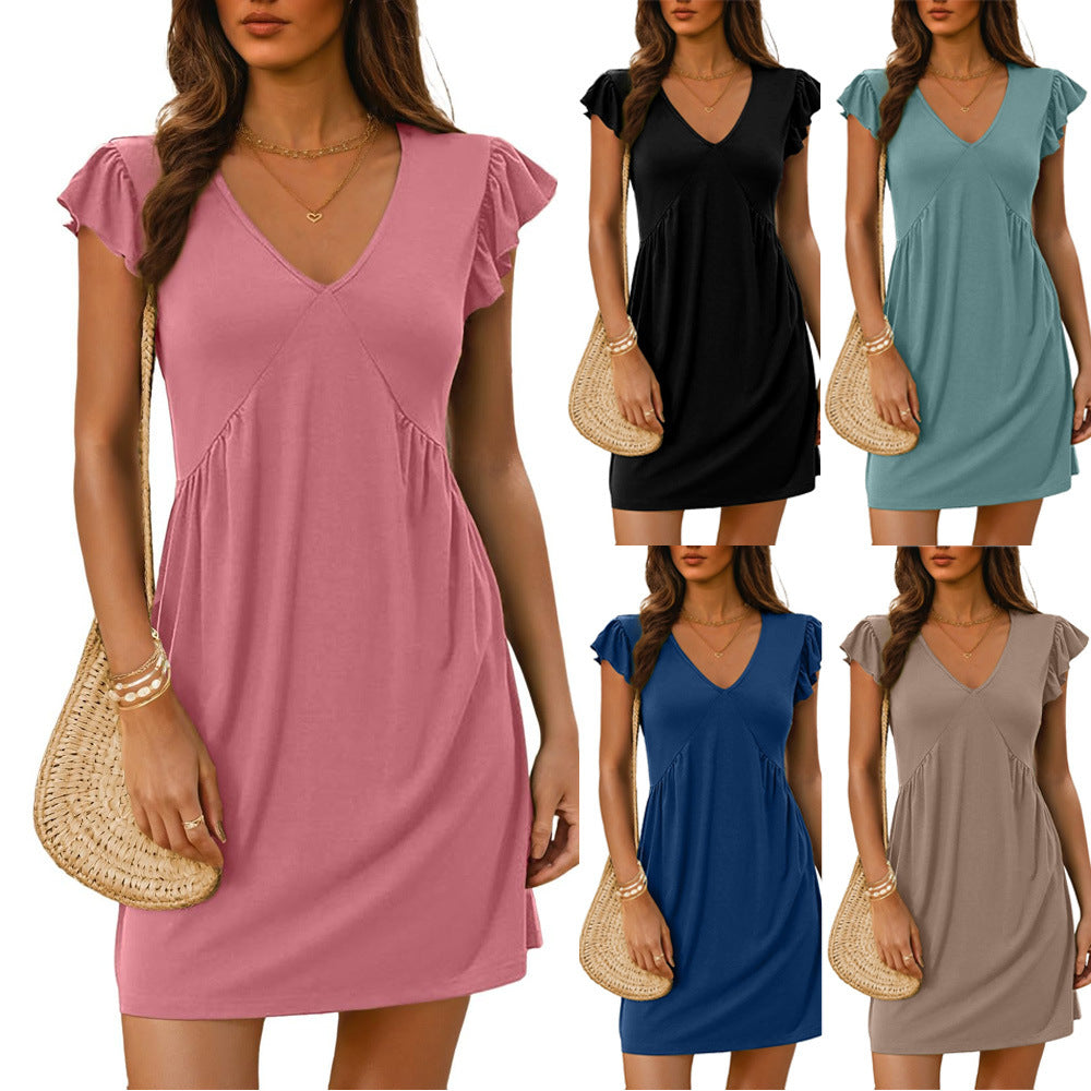 Cette élégante robe d'été allie confort et élégance de manière parfaite. Avec un décolleté en V flatteur et de charmants détails en volants sur les manches courtes, elle est idéale pour les journées chaudes et les occasions spéciales.