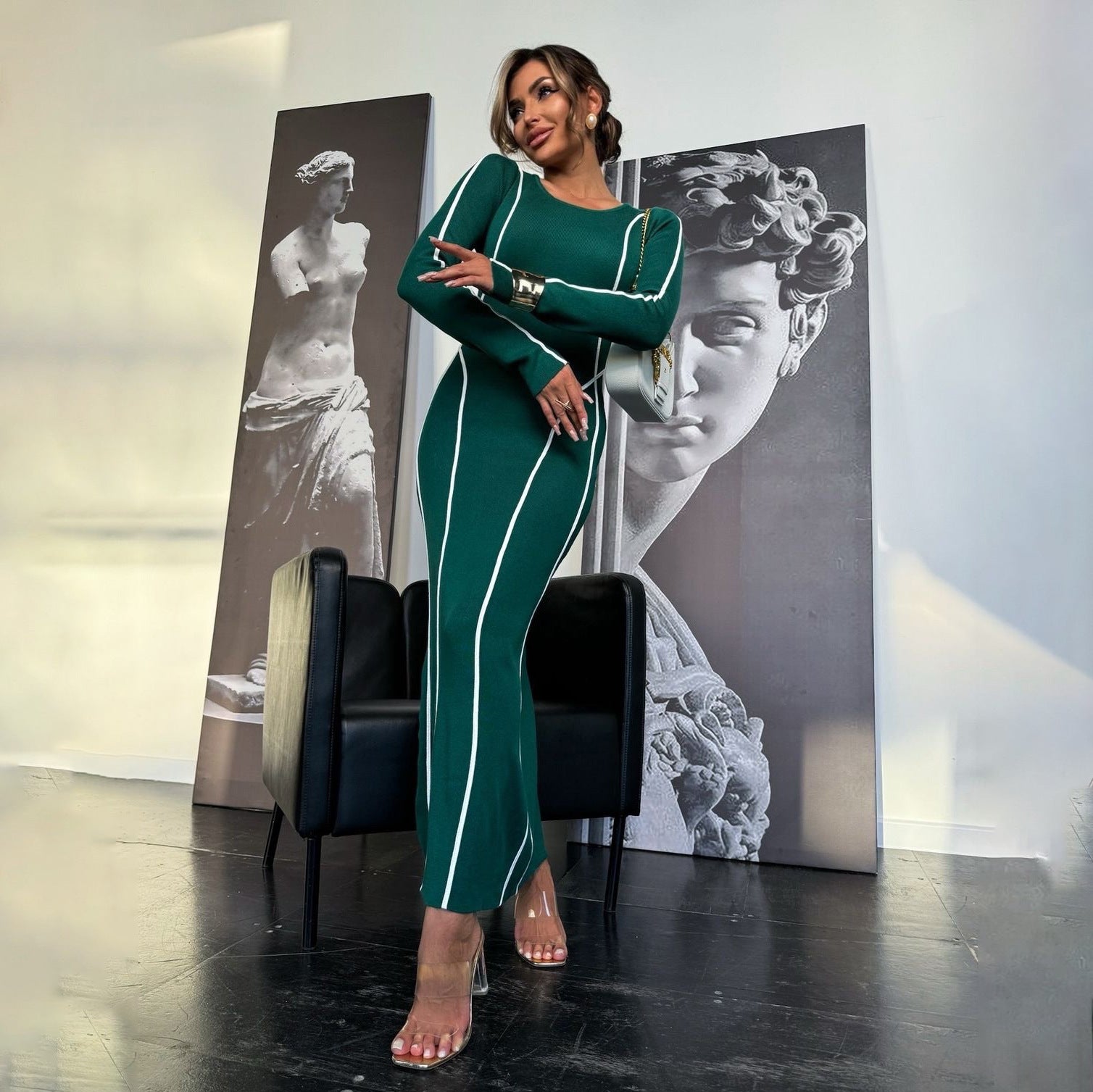 Découvrez notre robe en tricot stylée et ajustée, qui donne à chaque fashionista un look élégant. Avec un design unique contrastant des lignes noires, cette robe met en valeur votre silhouette et vous fait toujours paraître charmante.