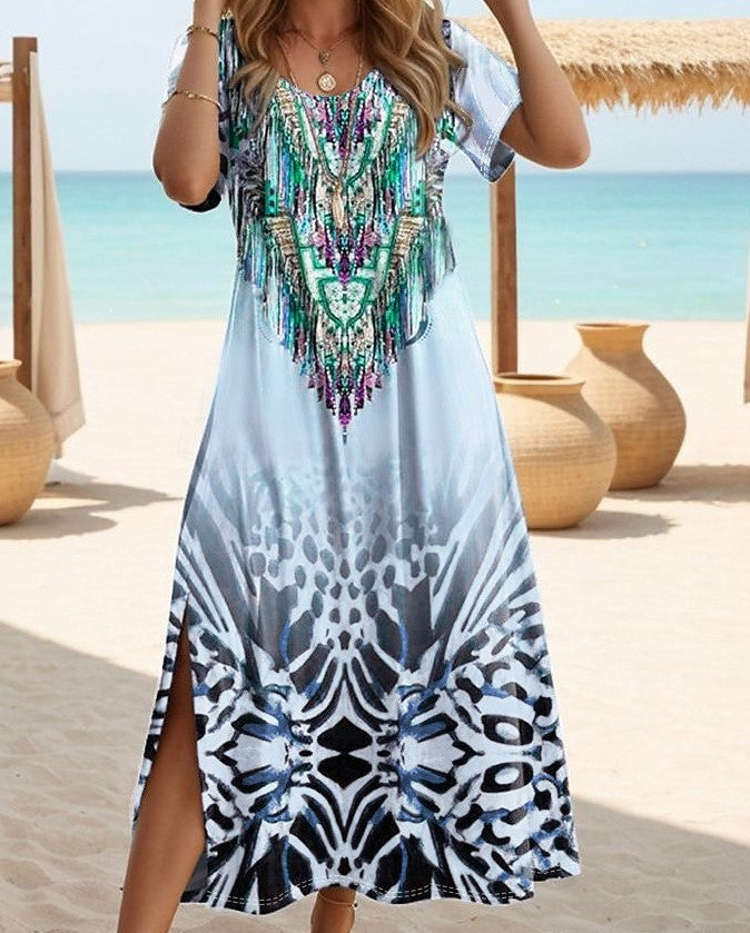 Découvrez notre élégante robe maxi pour femmes, qui se distingue par son remarquable ornement en sequins et son motif floral exquis. Cette robe est parfaite pour les occasions spéciales ou les journées relaxantes à la plage. La silhouette décontractée mais chic offre un confort optimal et une sensation agréable.
