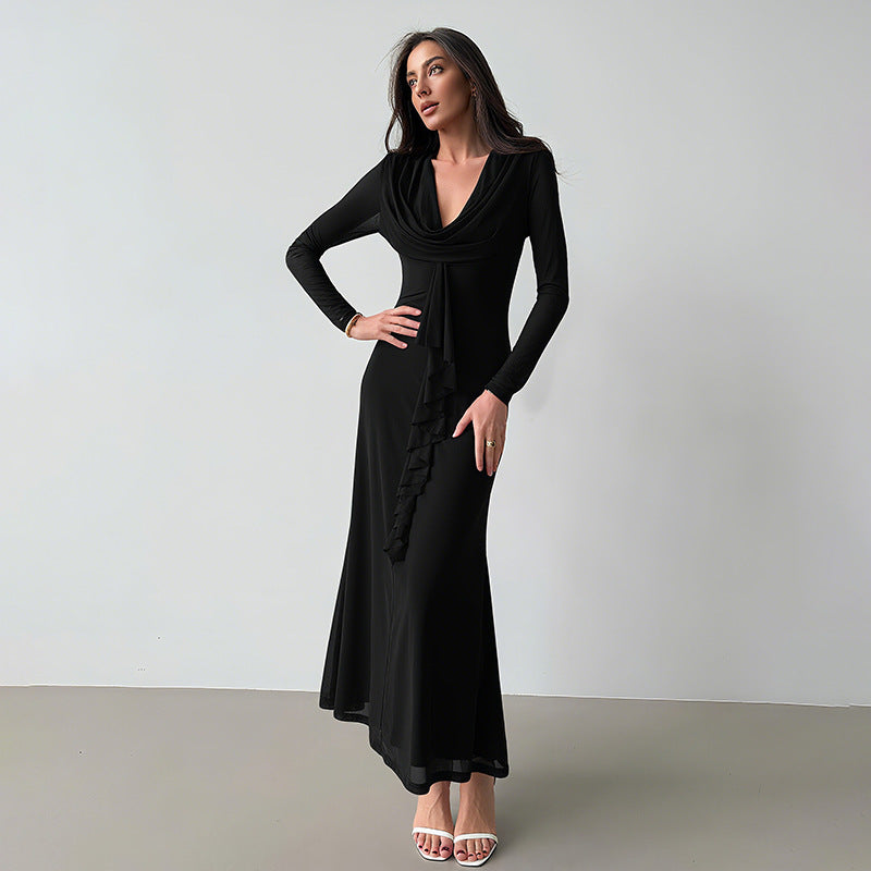 Robe maxi élégante pour femmes avec décolleté en V profond et détail volant Chic und Stil