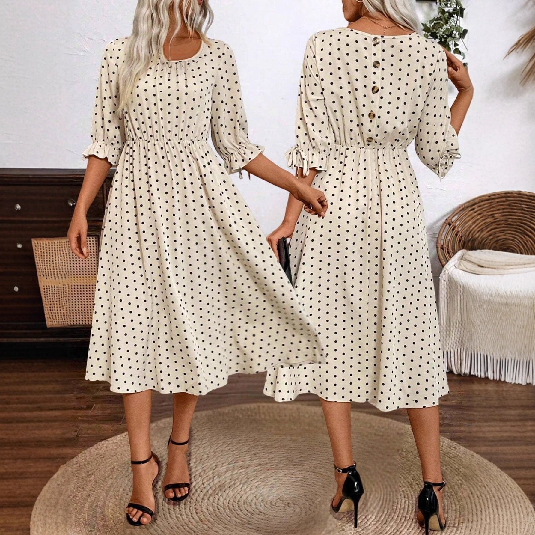 Cette robe midi élégante offre la combinaison parfaite de confort et d'élégance. Le design classique avec des pois joyeux ajoute une touche ludique, tandis que les manches bouffantes donnent à la robe une touche moderne.