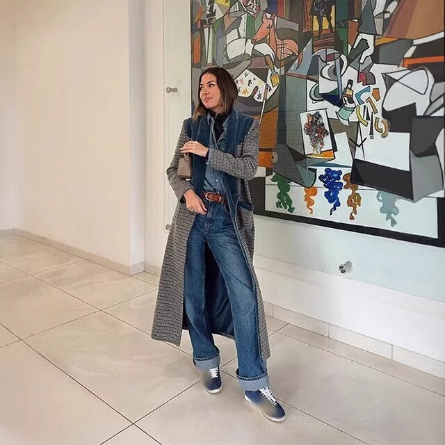 Elegant long jacket for women with a fine check pattern and a fluffy collar Chic and Style