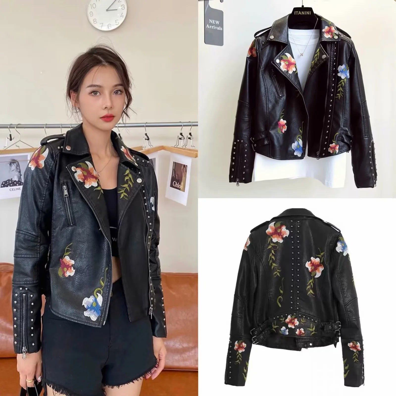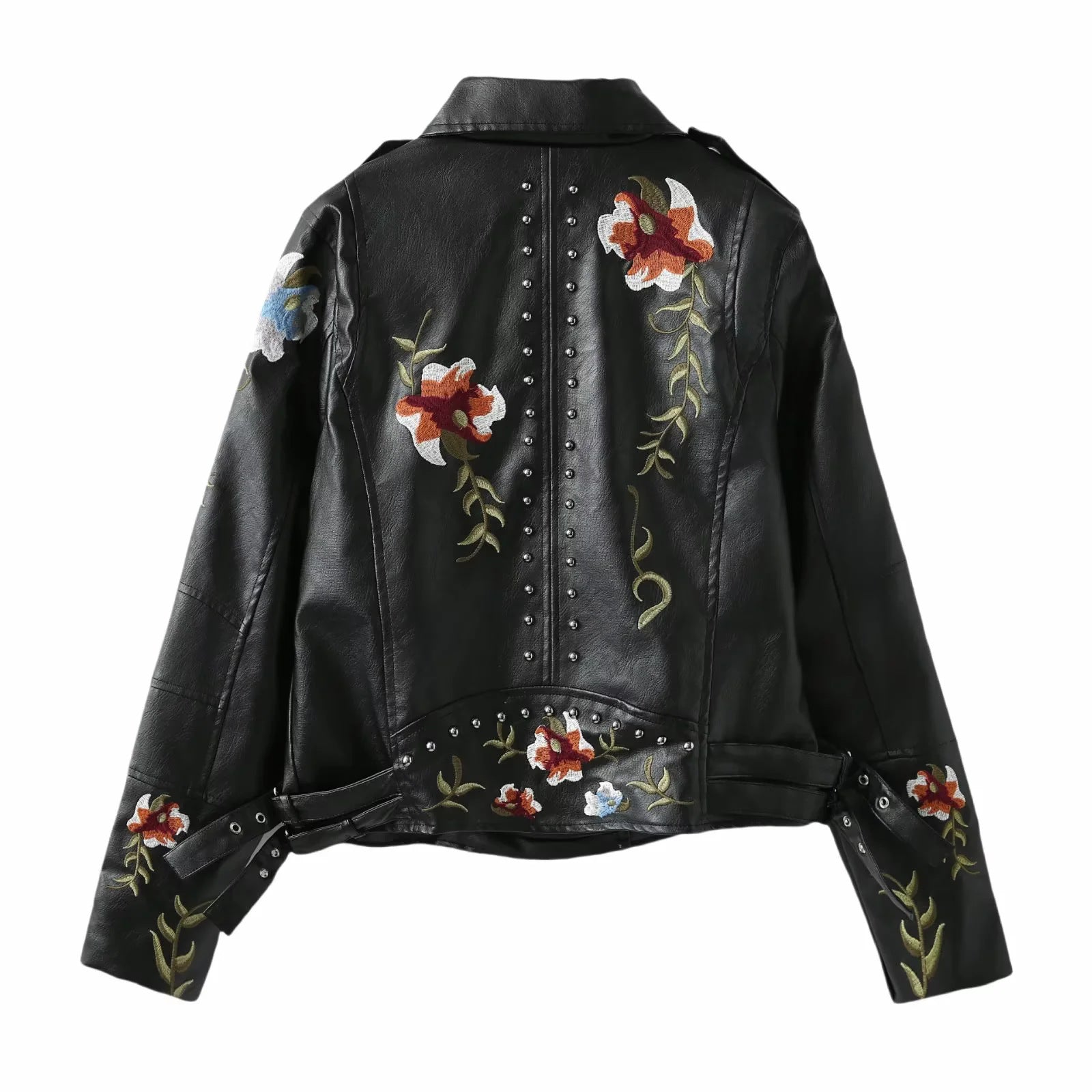 Biker jacket in faux leather for women with embroidered floral design and stud embellishments Chic and Style