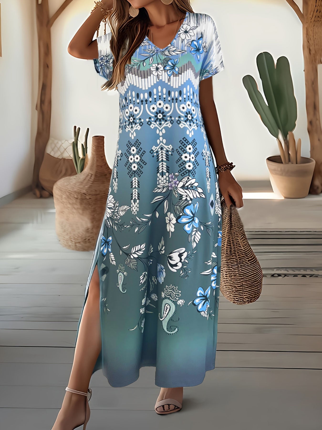 Faites une entrée en élégance avec notre magnifique robe maxi à imprimé floral pour femmes, conçue pour la femme moderne qui apprécie à la fois le confort et le style. Cette robe maxi époustouflante se distingue par son imprimé floral et géométrique unique, créant un effet visuel impressionnant qui capture l'essence de la mode d'été audacieuse.