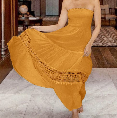Pénétrez dans l'élégance sans effort avec notre robe maxi sans bretelles pour femmes ornée de dentelle élégante. Cette robe éblouissante présente un haut magnifiquement conçu qui souligne vos courbes tout en offrant un confort exceptionnel. Le design sans bretelles met en valeur vos épaules et votre décolleté, ce qui la rend idéale pour des sorties par temps chaud et des occasions spéciales.