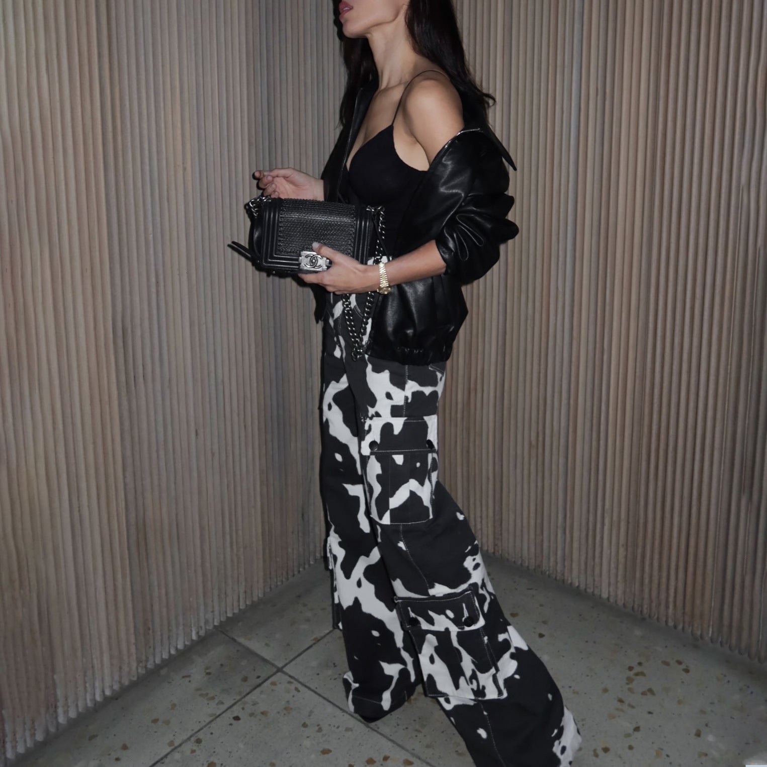 - Eye-catching Pattern: The bold black and white cow print gives a trendy touch to the pants.