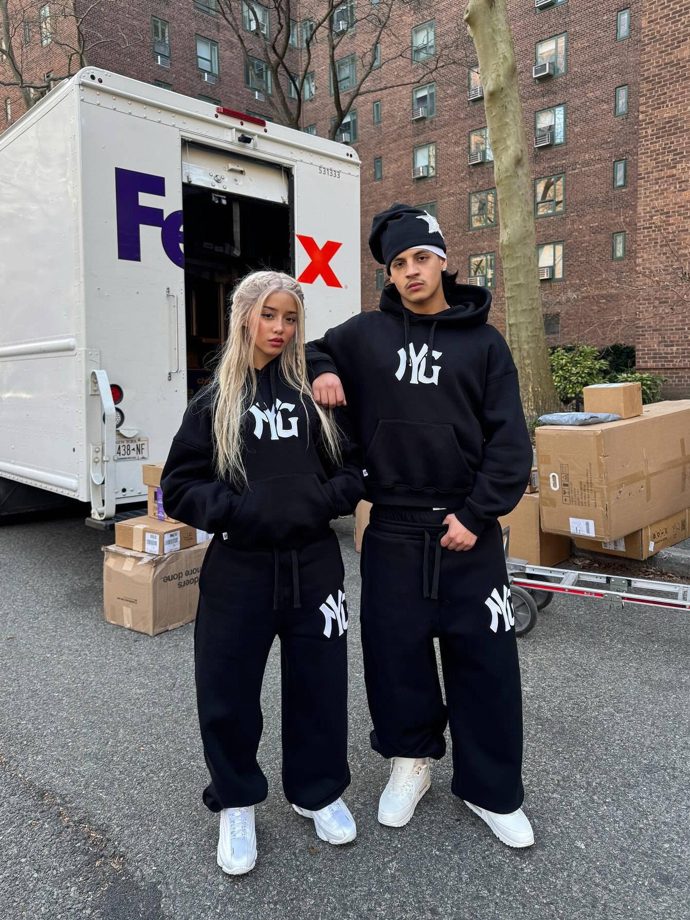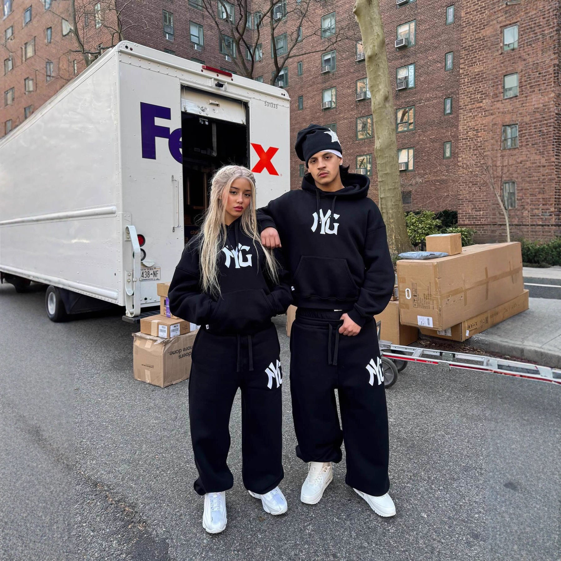 - Practical details: The hoodie features a kangaroo pocket and a sturdy zipper, while the jogging pants are equipped with an elastic waistband and pockets.
