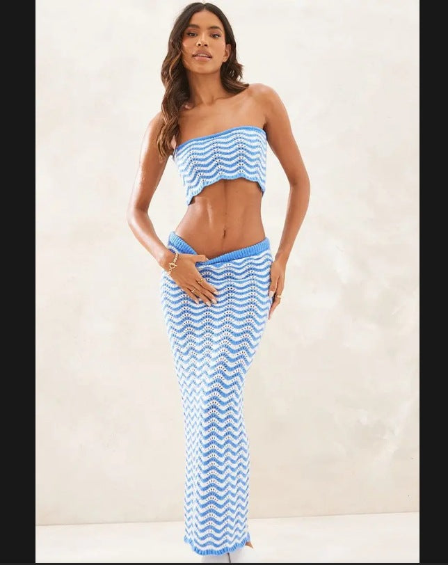 Découvrez la tenue parfaite pour l'été avec cette élégante robe bandeau pour femmes de Chic und Stil. La robe se distingue par son design en crochet unique, offrant un look à la fois élégant et tendance. La combinaison de motifs ondulés dans des teintes douces de bleu et de blanc donne à la robe un aspect frais et moderne.