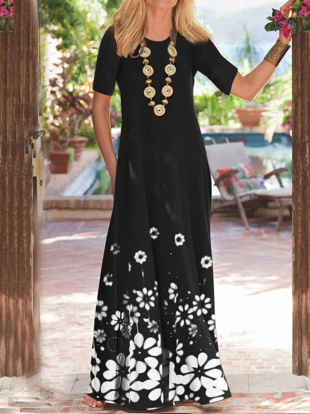 Cette robe maxi pour femmes allie confort et design élégant. Avec un impressionnant imprimé floral et une coupe fluide, elle offre une coupe parfaitement flatteuse pour toutes les silhouettes. Les poches latérales sont non seulement pratiques, mais apportent également une touche décontractée à la robe, idéale pour l'été.