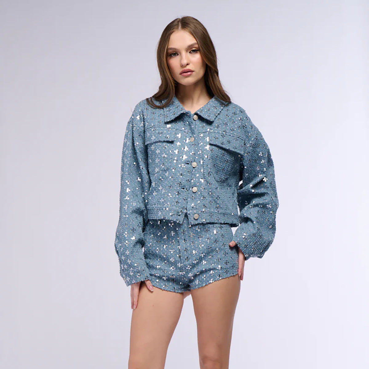 Cropped denim jacket for women with sparkling star pattern and matching shorts Chic and Style