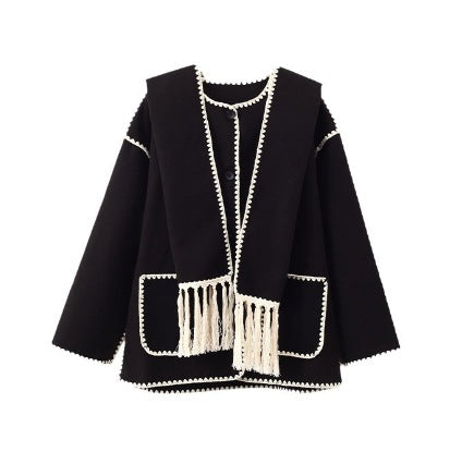 - Elegant fringes: The decorative fringes at the hems give the jacket a fashionable touch.