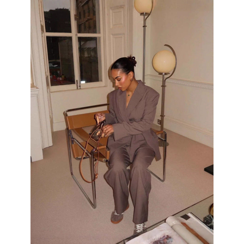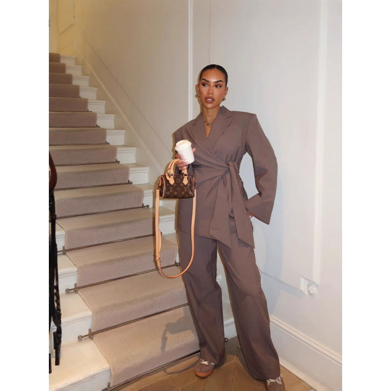 Discover our elegant and stylish blazer and pant set, perfect for ladies who care about their style. This set combines a fitted blazer with matching wide-legged pants, creating a timeless silhouette. The blazer features a chic button closure and a belted waist that emphasizes the figure and gives a feminine look.