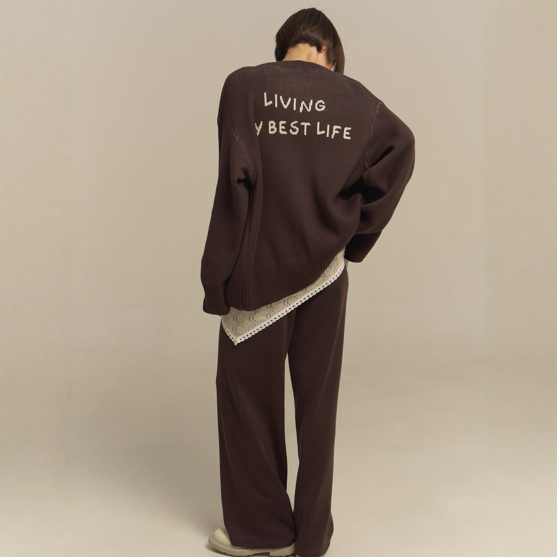 - Oversized sweater: The sweater stands out with its relaxed fit and offers optimal freedom of movement. With a catchy slogan on the back, it conveys a positive attitude towards life.