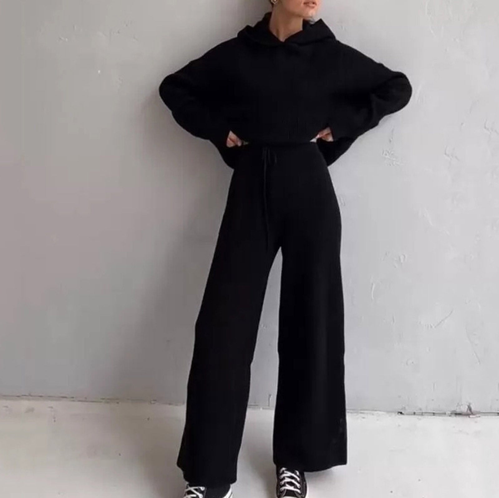 Casual knitted set for women with oversized hoodie and wide pants Chic and Style